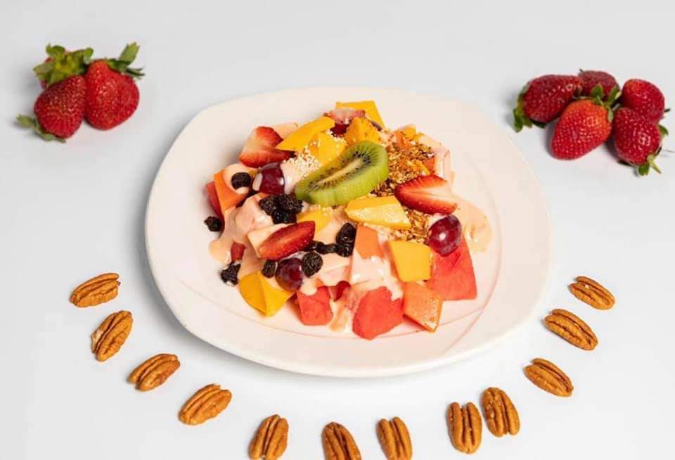 Fresa, mango, plátano, manzana, granola, amaranto, avena, pasas, chocomilk, rompope, y leche.