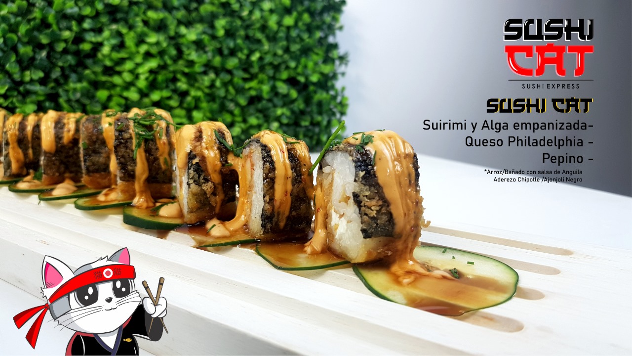 Surimi empanizado, queso Philadelphia, Alga empanizada, arroz, bañado con salsa dulce, aderezo chipotle y ajonjolí espolvoreado