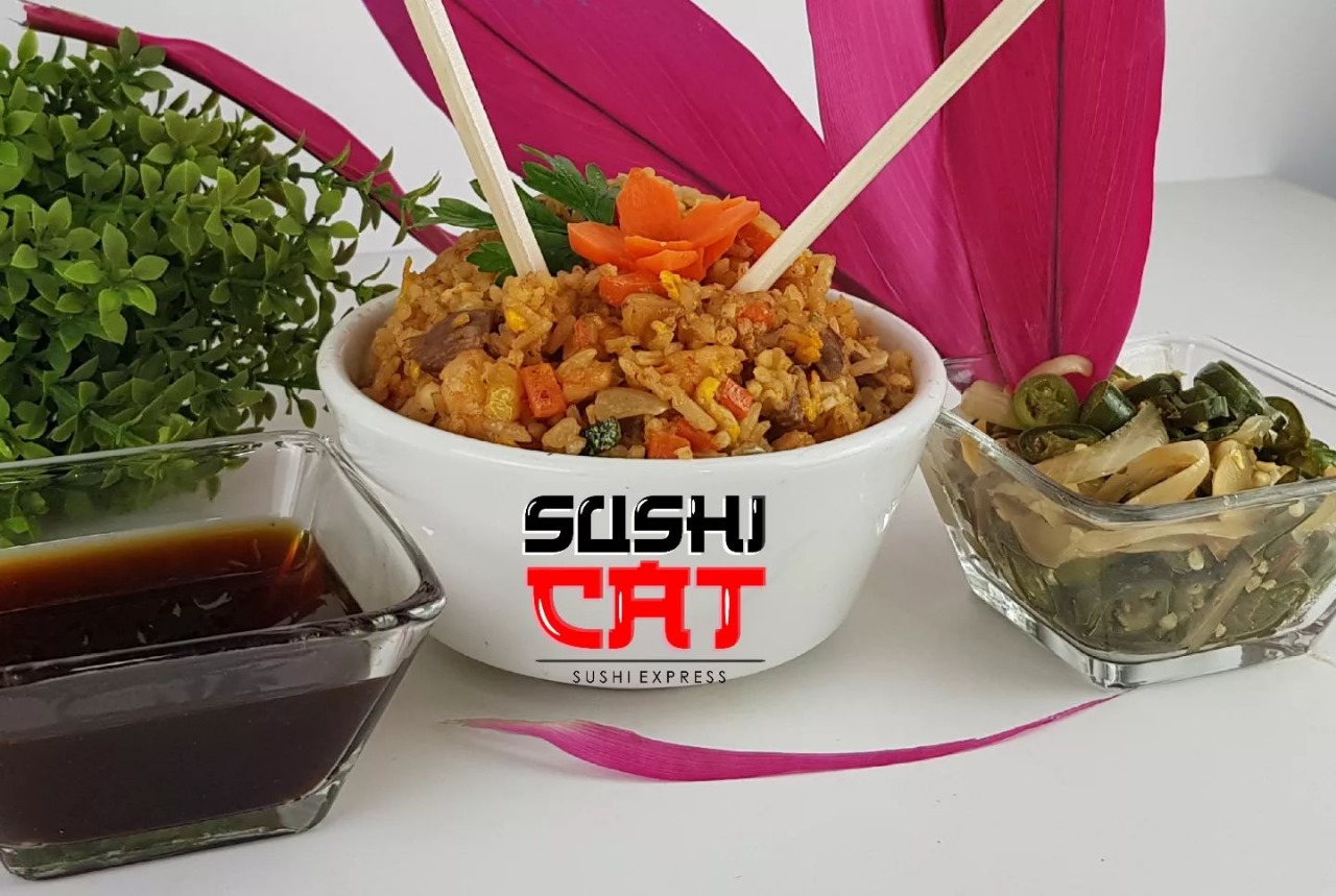 Yakimeshi Tradicional con arroz, camarón, Huevo, Cebolla, calabaza, zanahoria pollo y res