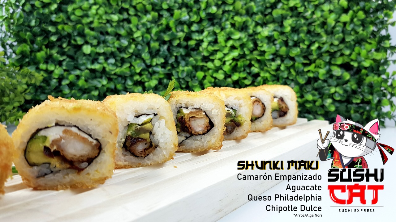 Camaron Tempura, Surimi empanizado, queso Philadelphia, Aguacate, Alga y Arroz, con aderezo chipotle y salsa Dulce