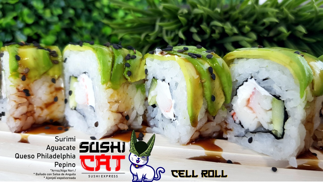 Surimi, aguacate, queso philadelphia, pepino, alga y arroz bañado con salsa de anguila y ajonjolí espolvoreado