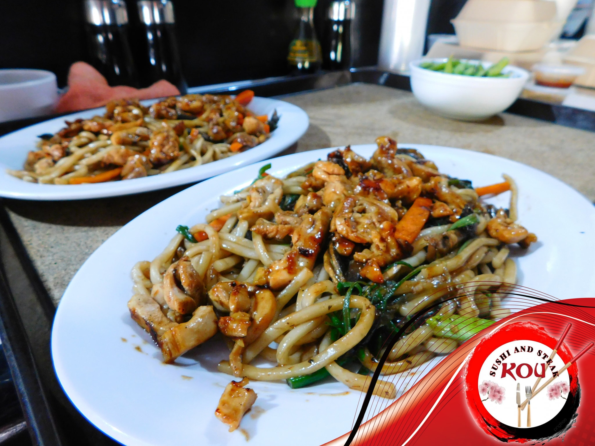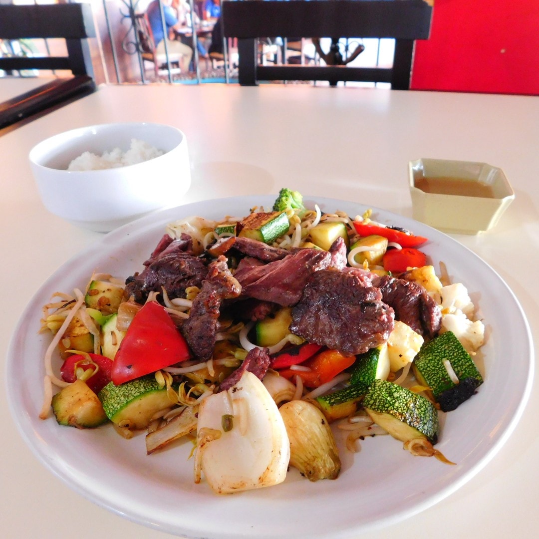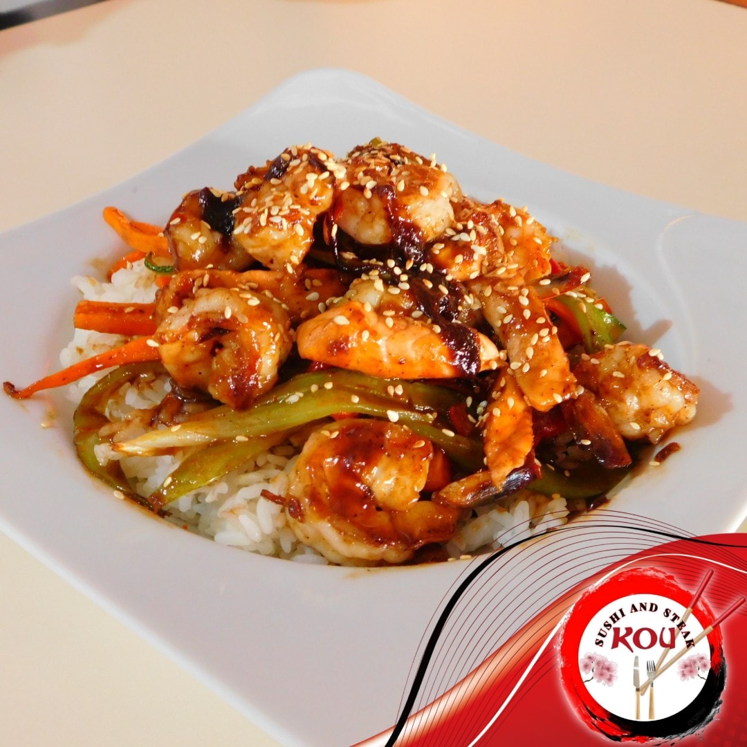 Platillo japonés con verduras asadas, servido con arroz blanco y salsa de ajonjolí. Con res, pollo y camarón.