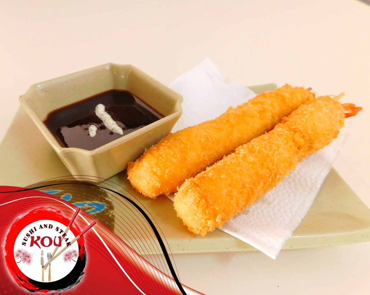 Por dentro: camarón empanizado y aguacate; por fuera: queso crema y tampico.