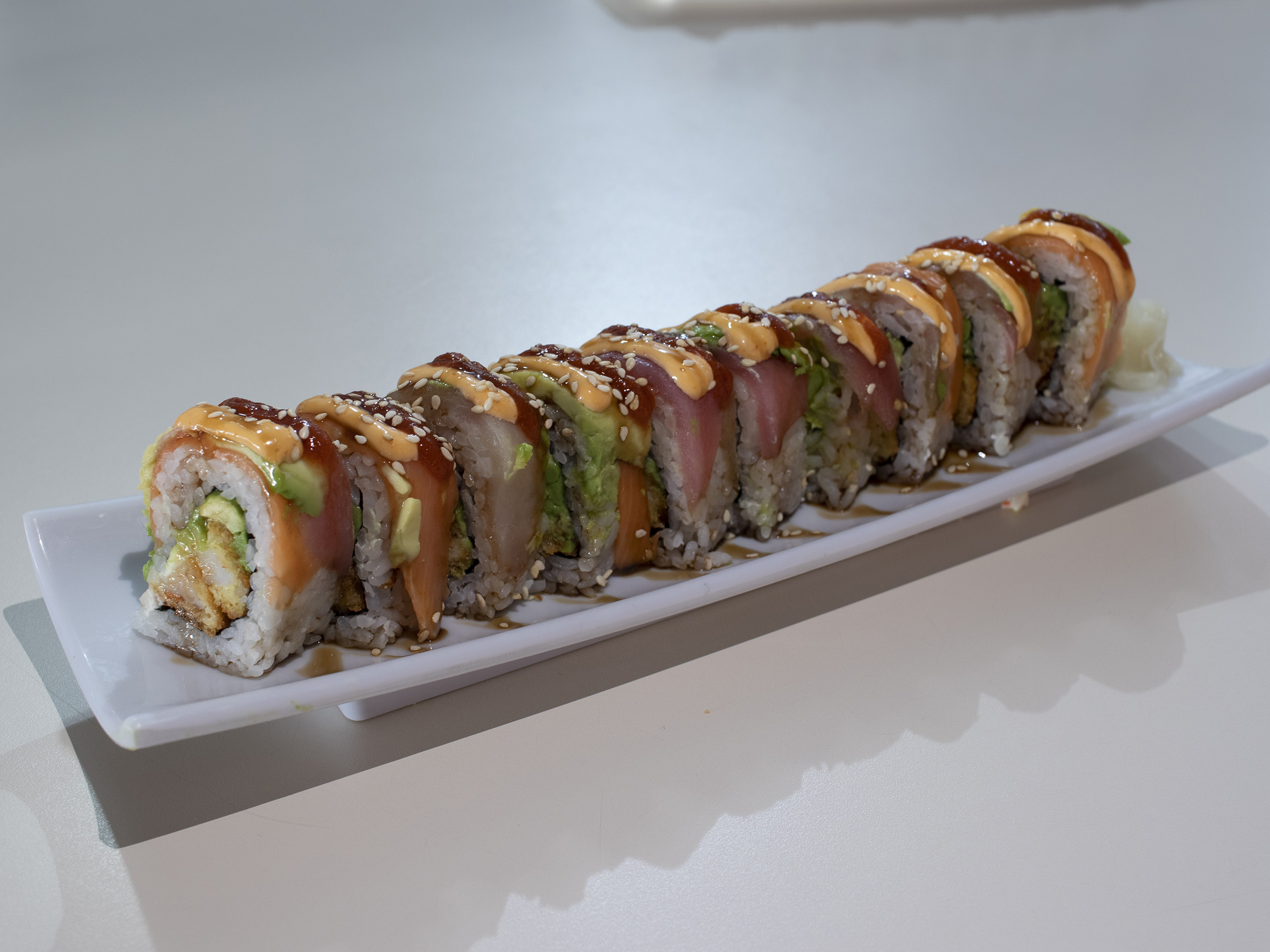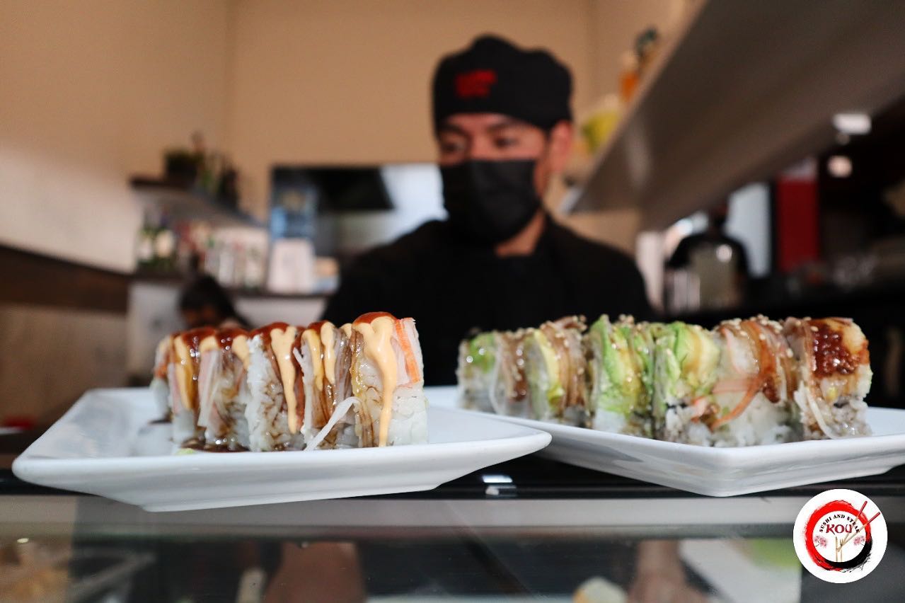 Por dentro: spicy cangrejo, kakiague y aguacate; por fuera: atún, salsa kou y masago.