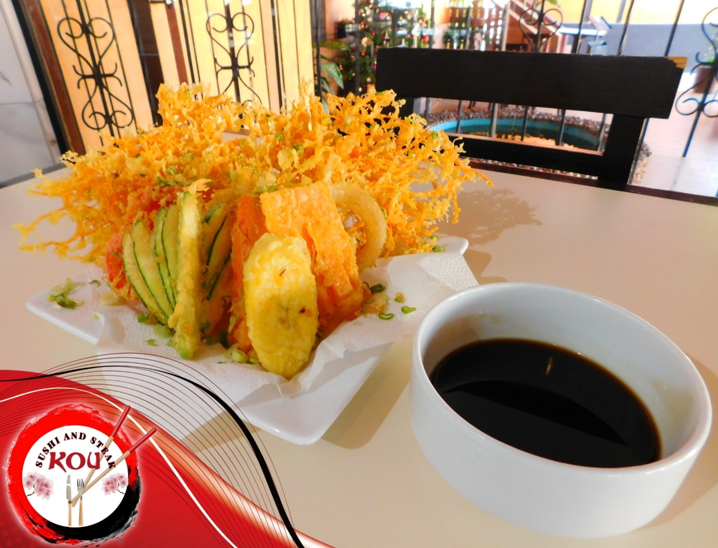 Verduras capeadas en una mezcla de harina japonesa. Cebolla, camote, plátano macho, calabaza, kakiague, aguacate, brócoli, pimiento y coliflor.
