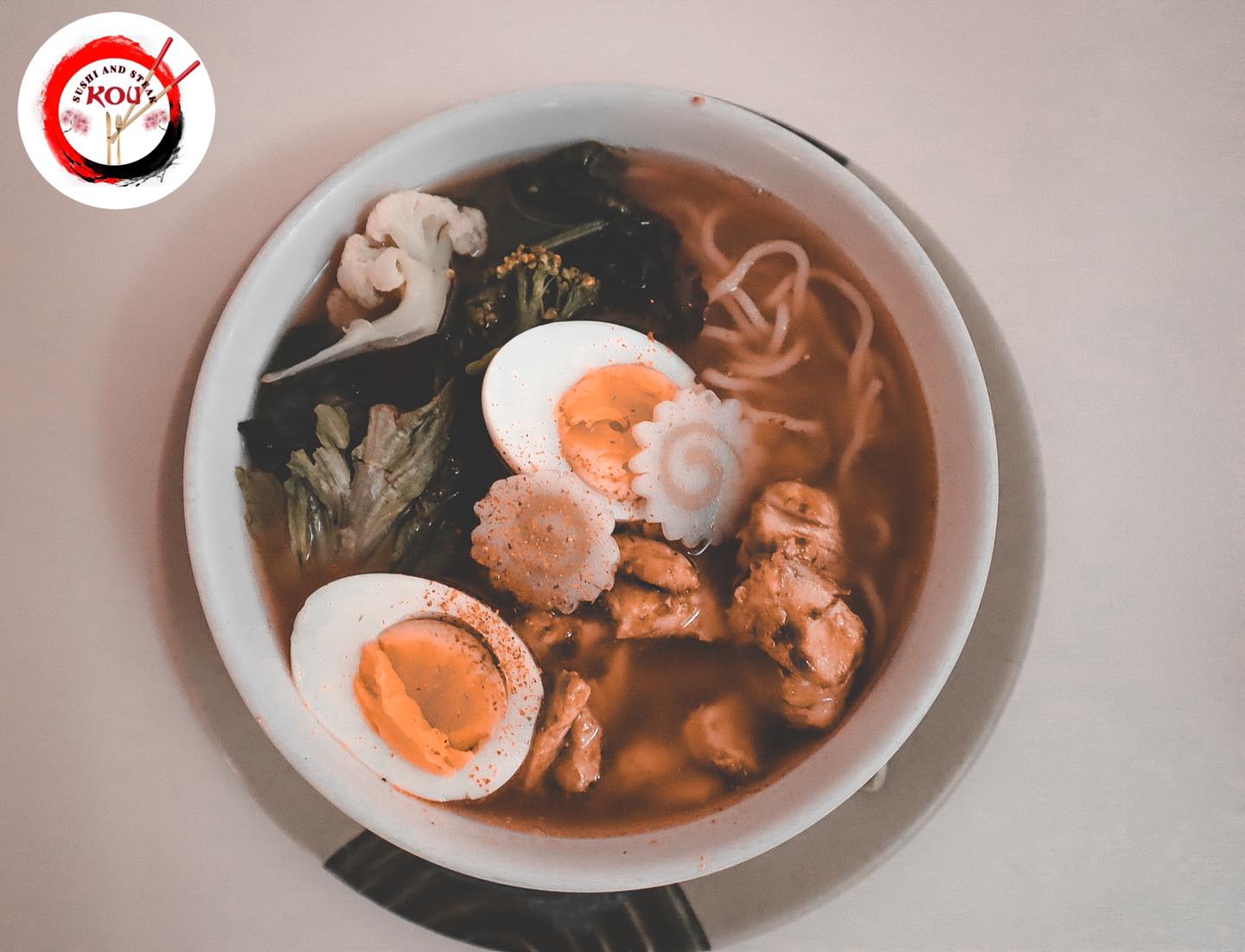 Sopa japonesa hecha con pasta ramen, huevo cocido, naruto y espinaca.
