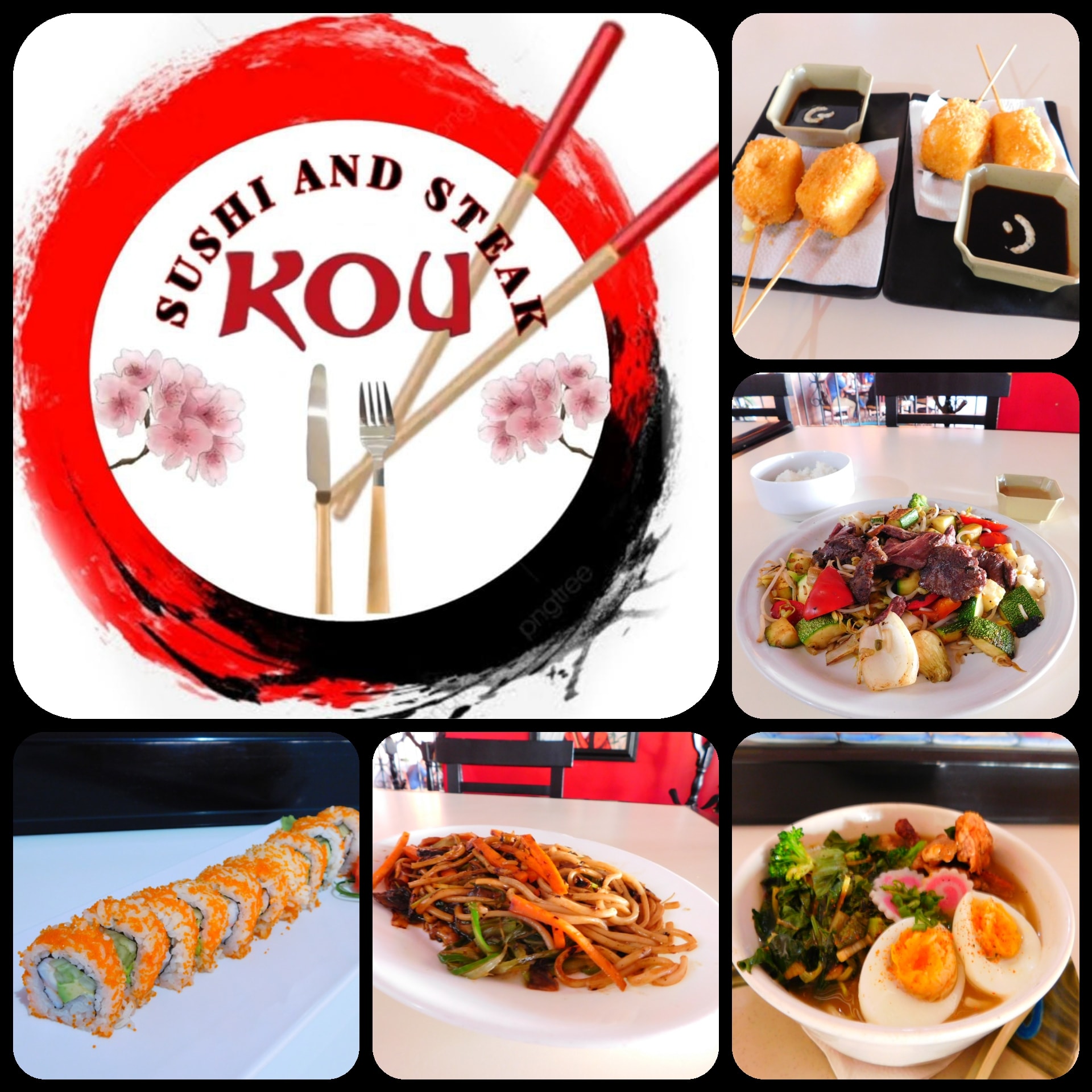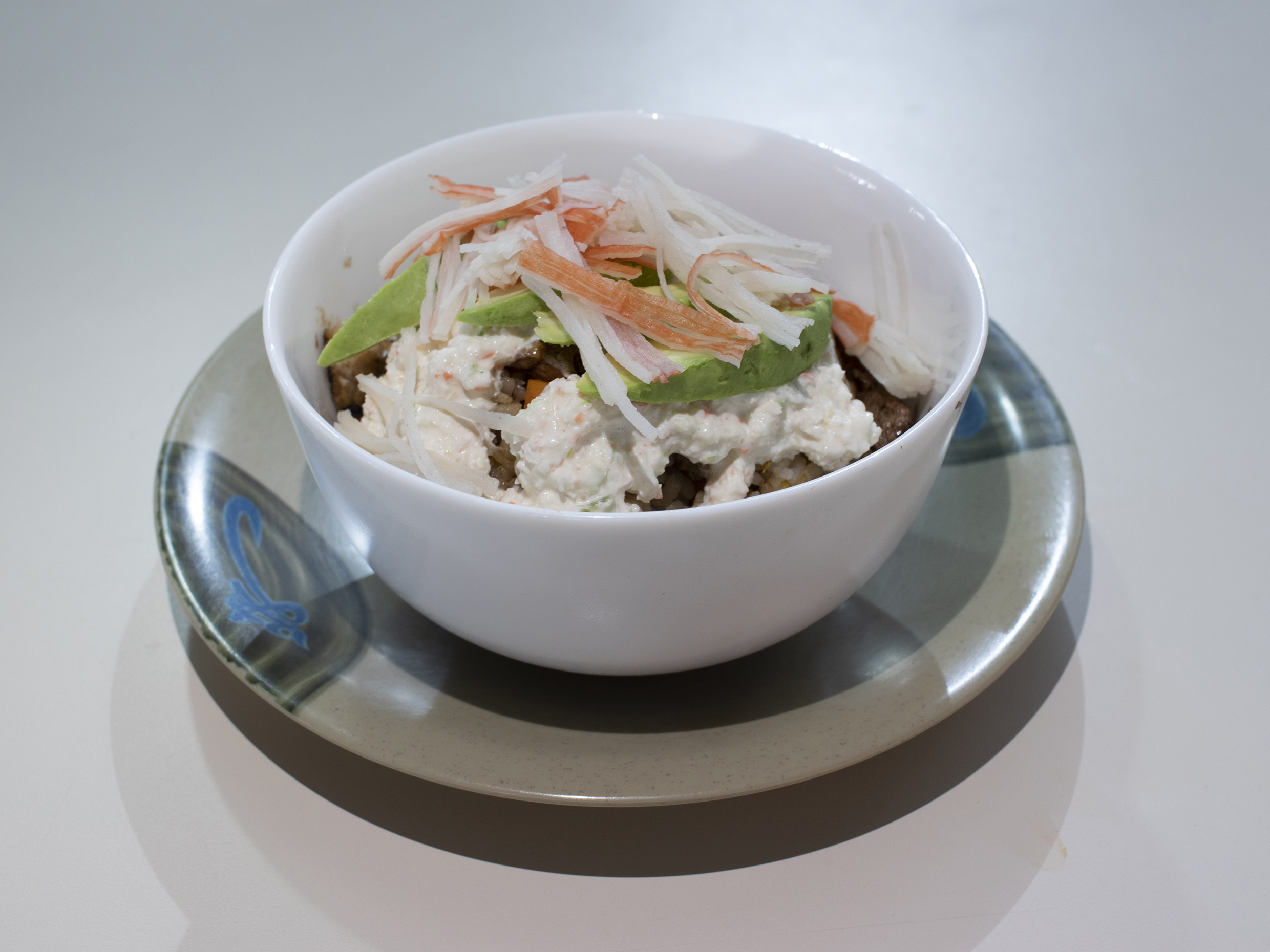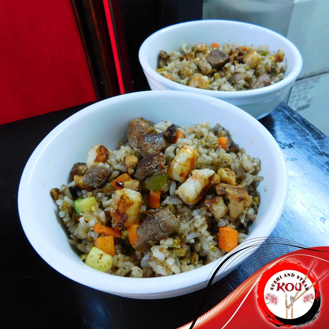 Filete de res con pollo, acompañado de kanikama, tampico y aguacate. Arroz japonés, acompañado de verduras, huevo y salsa de soya.