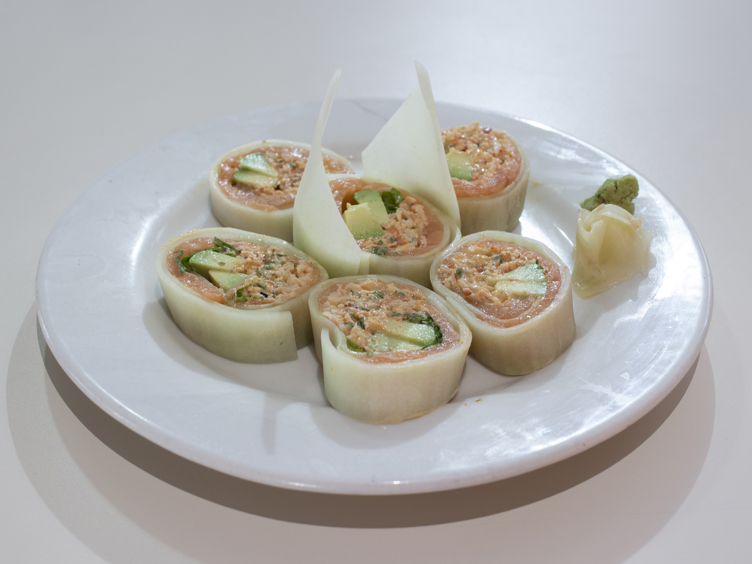 Por dentro: spicy cangrejo, aguacate y cilantro; por fuera: envuelto en salmón y pepino.