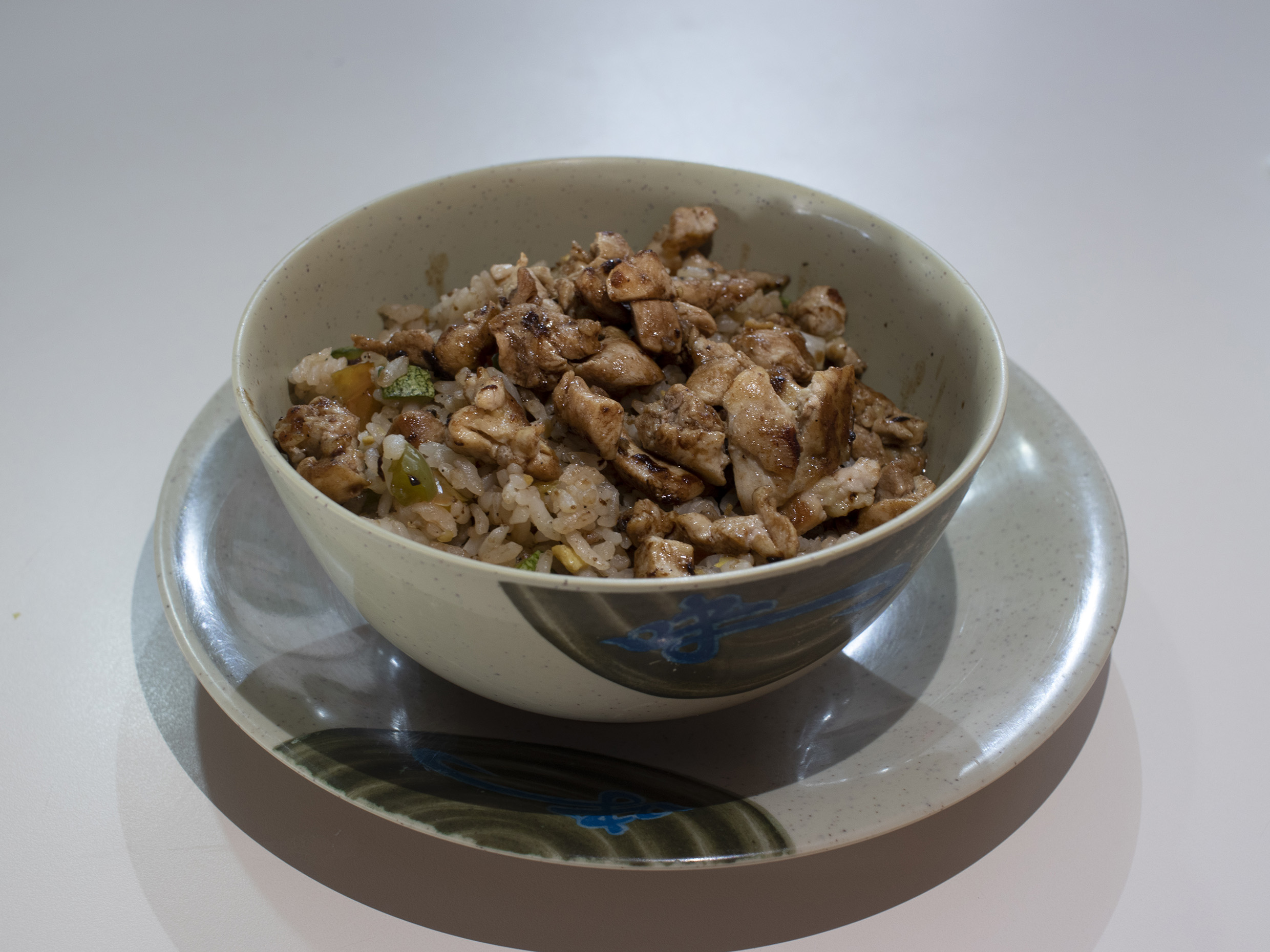 Res, pollo y camarón. Arroz japonés, acompañado de verduras, huevo y salsa de soya.