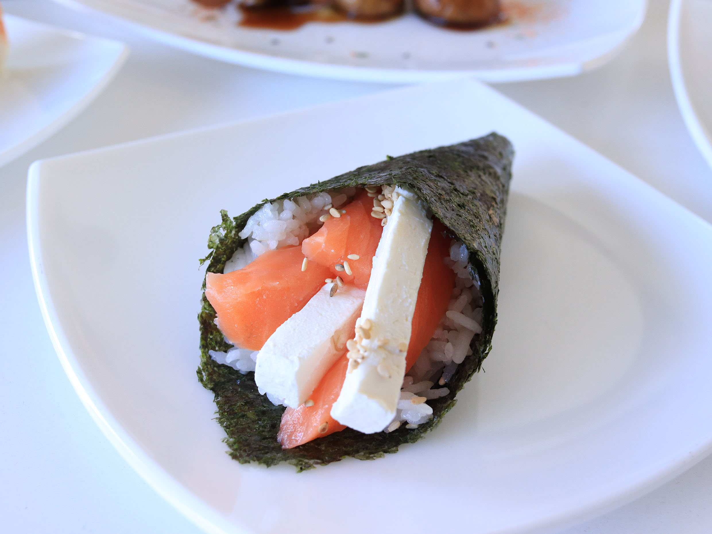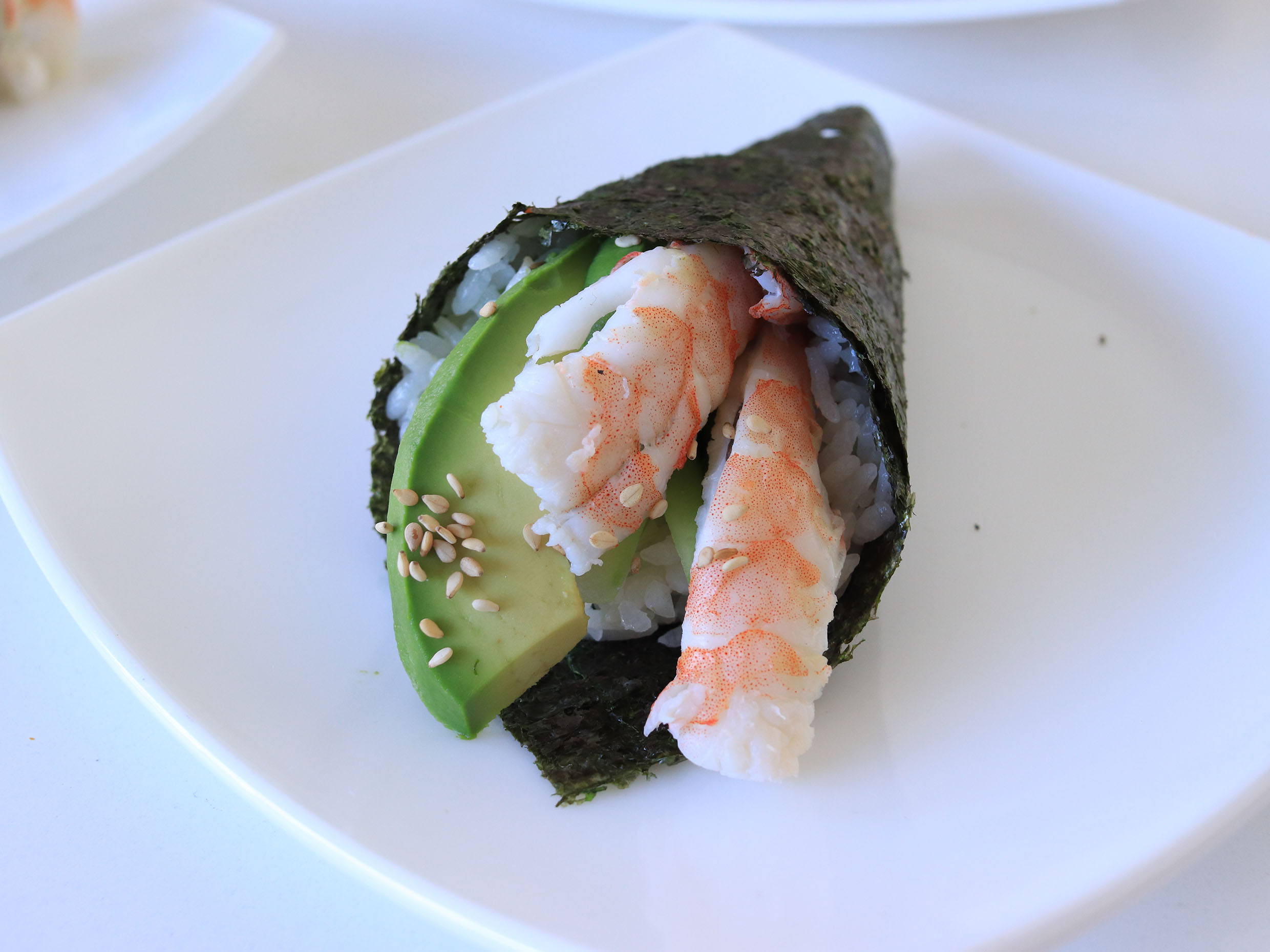 Camarón capeado, queso y aguacate por dentro; salmón ahumado y atún spicy por fuera.