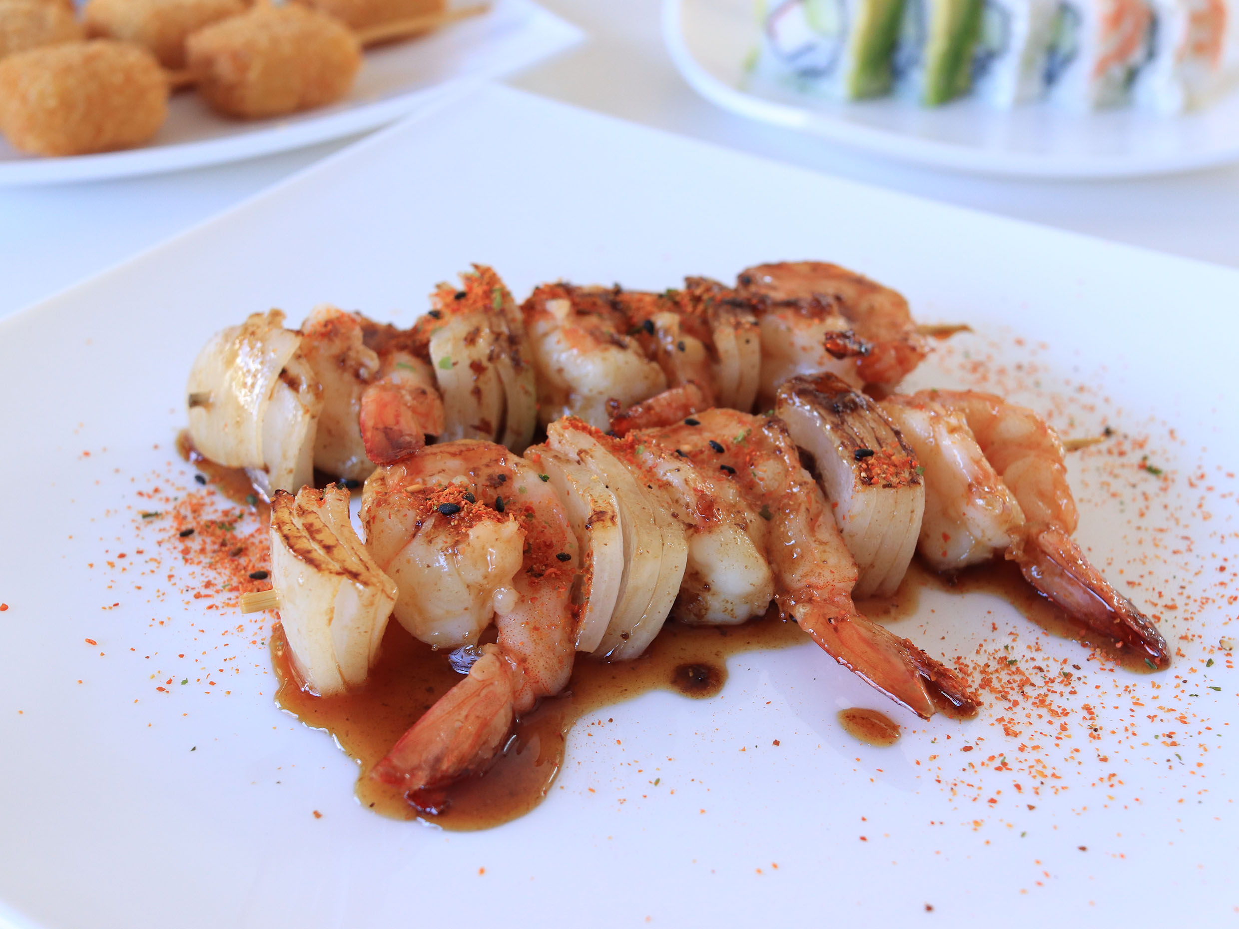 2 Piezas, brochetas asadas y marinadas en sala teriyaki de camarón y cebolla.