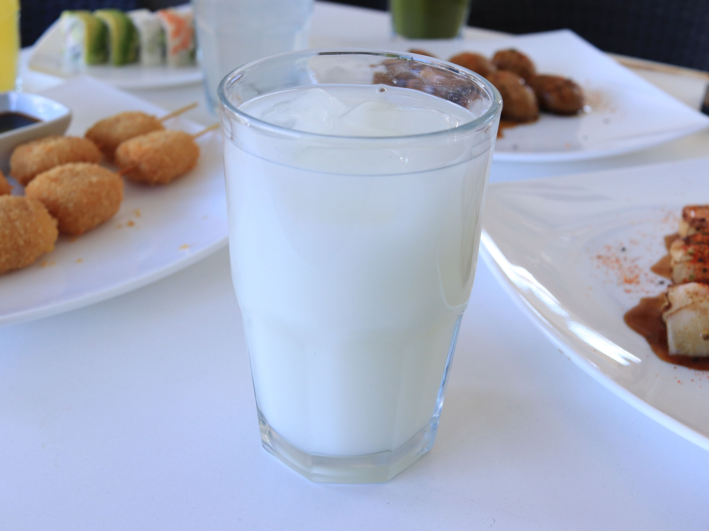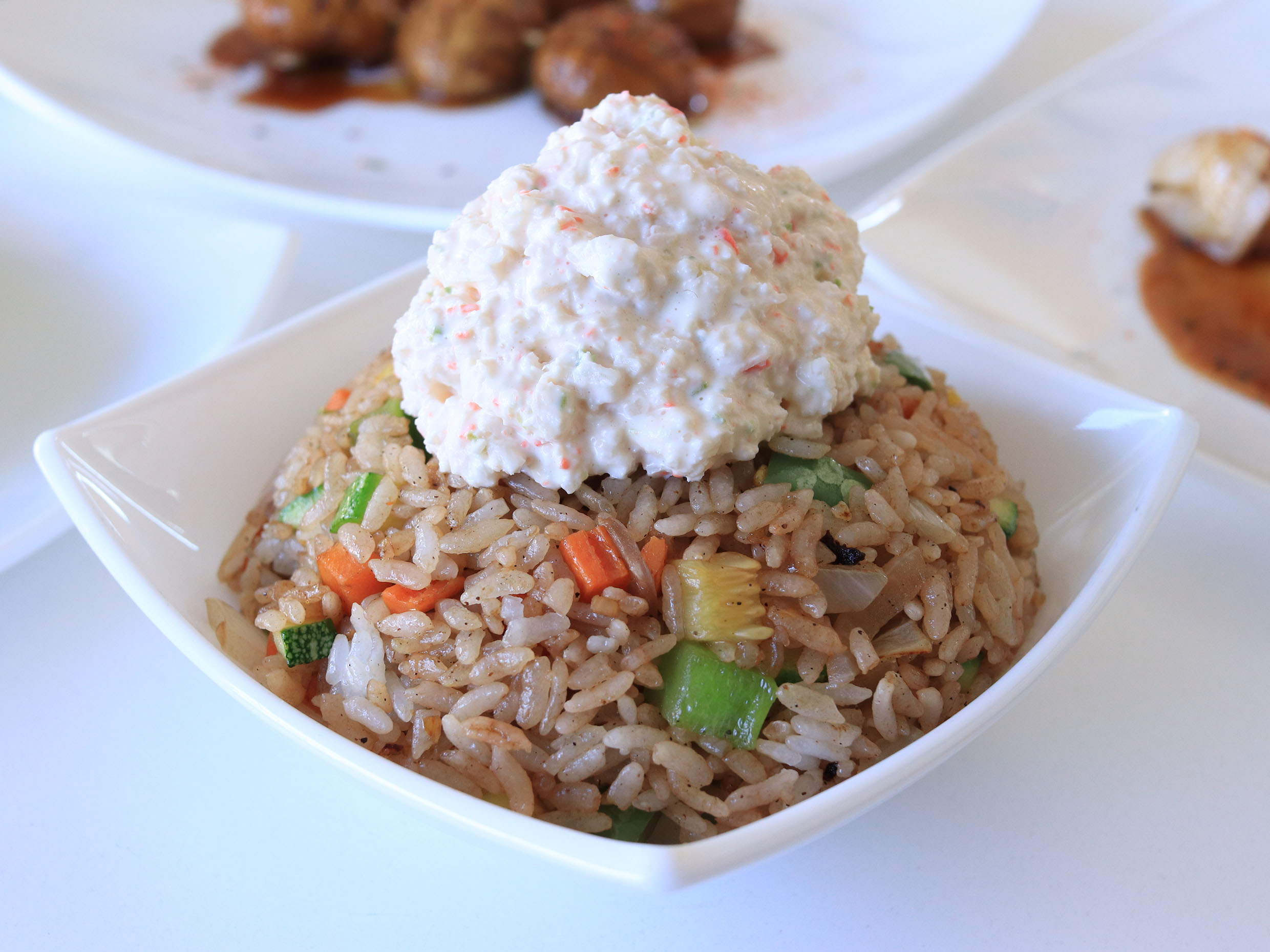 Tazón con arroz blanco al vapor surimi, queso crema, salsa tampico y aguacate; servido con salsa dulce.
