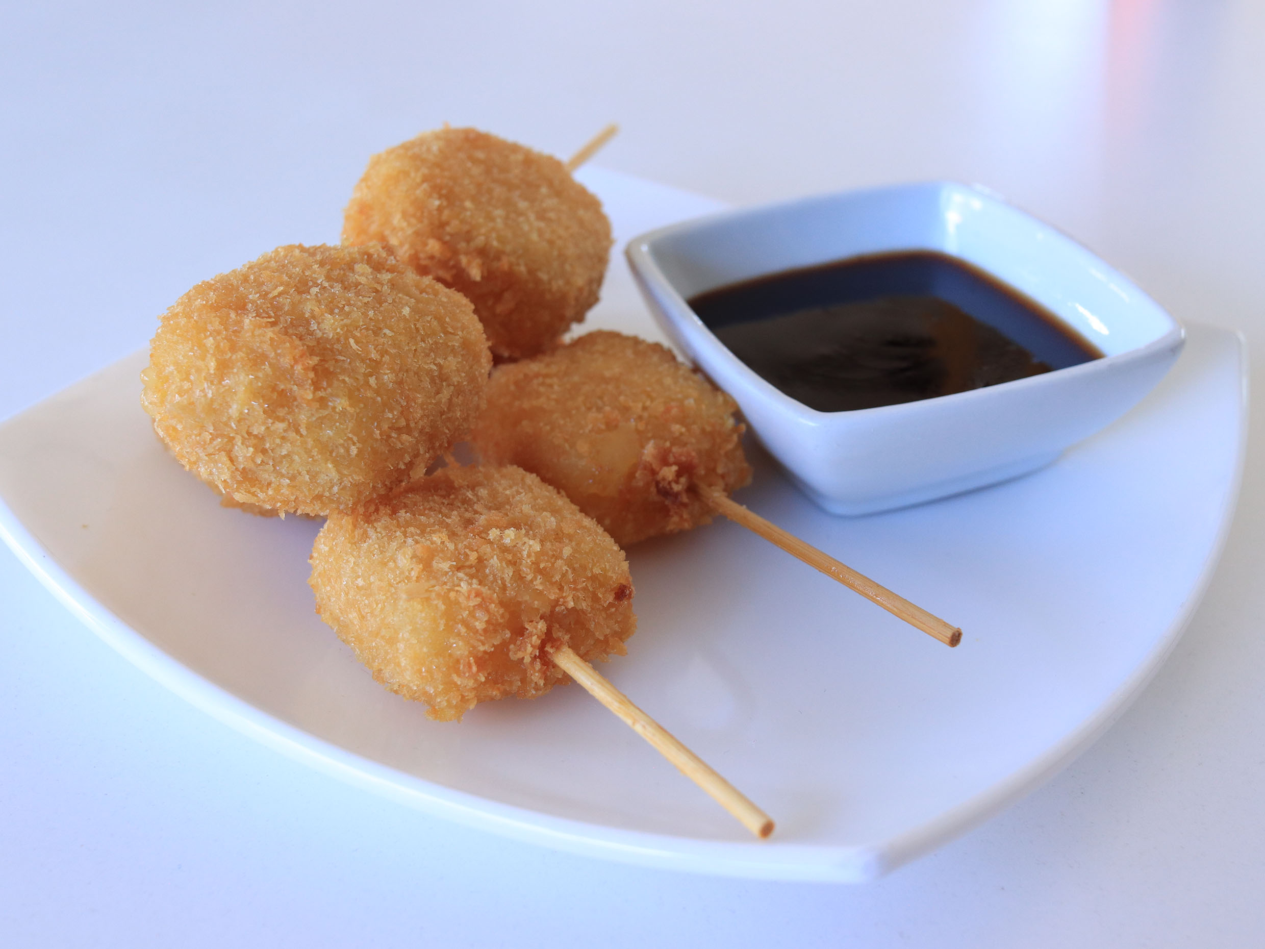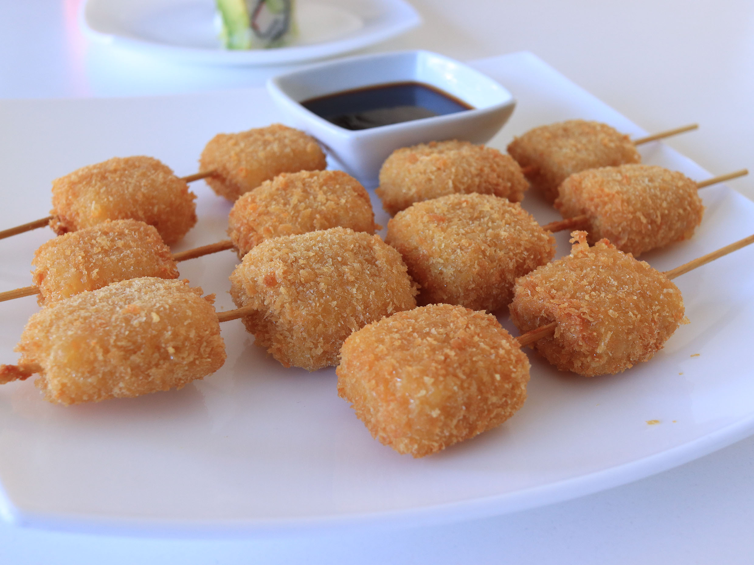 Aguacate, camarón al ajillo por dentro; queso crema y kakiage por fuera; servido con salsa chipotle y salsa tampico.