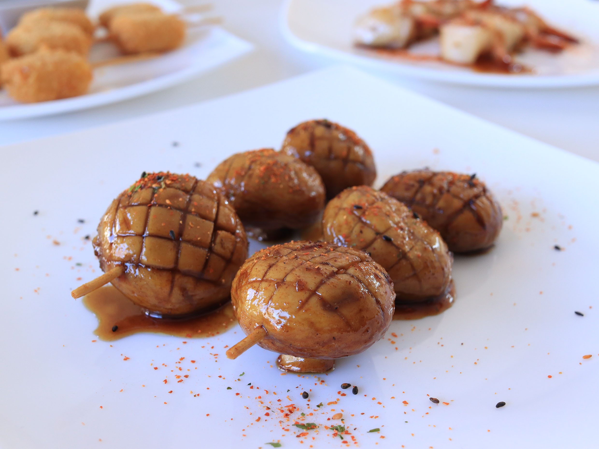 2 Piezas, brochetas asadas y marinadas en sala teriyaki de champiñón.
