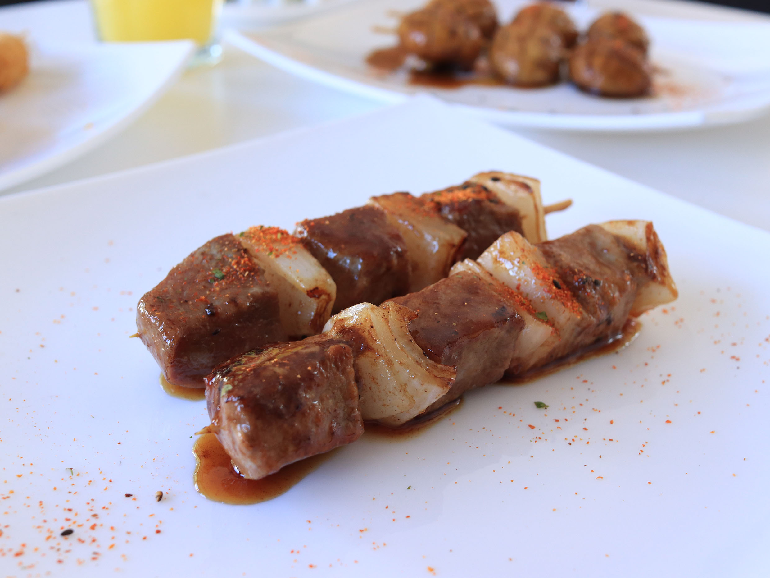 2 Piezas, brochetas asadas y marinadas en sala teriyaki de filete de res y cebolla,
