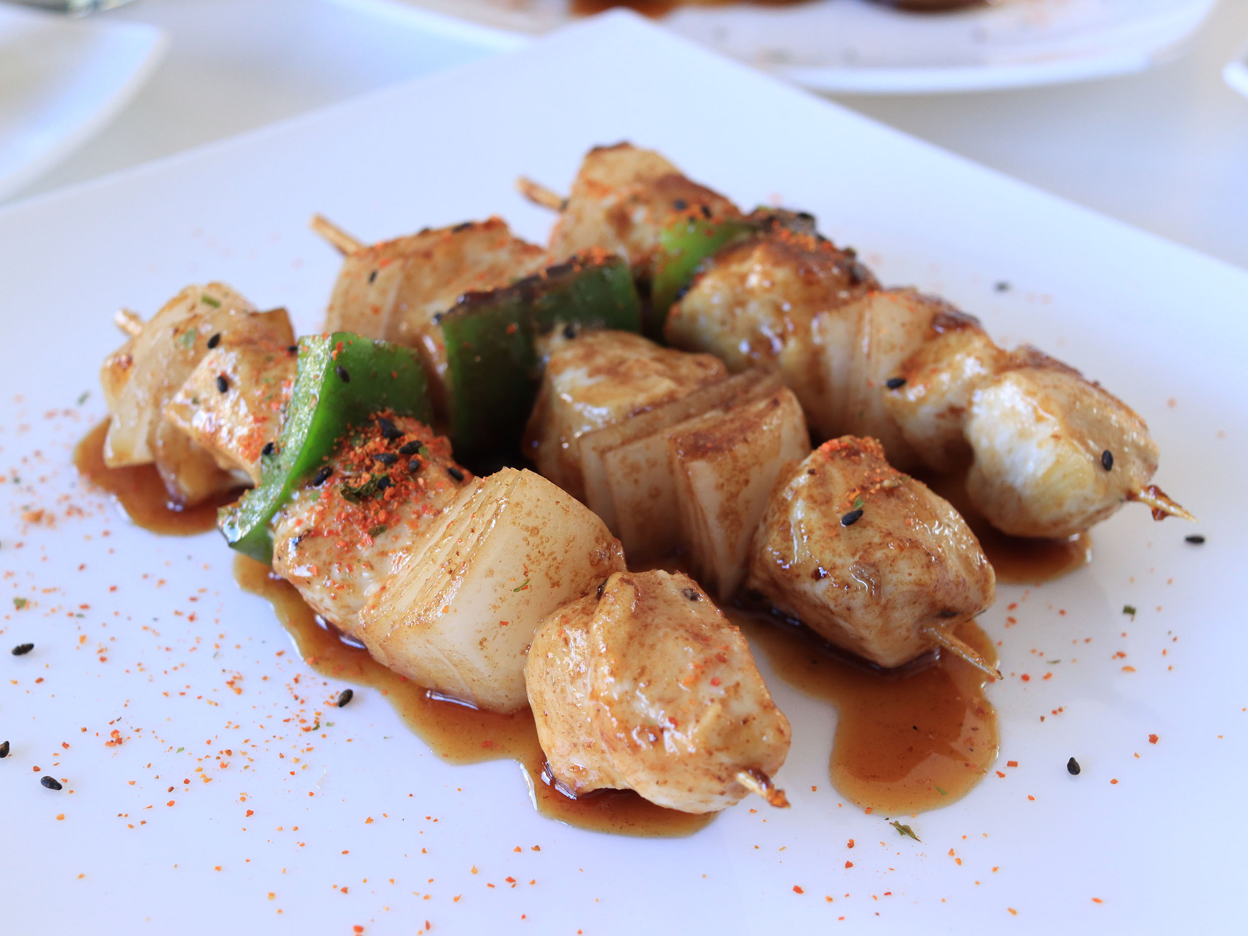 3 Piezas, brochetas asadas y marinadas en sala teriyaki de pollo, cebolla y pimiento.