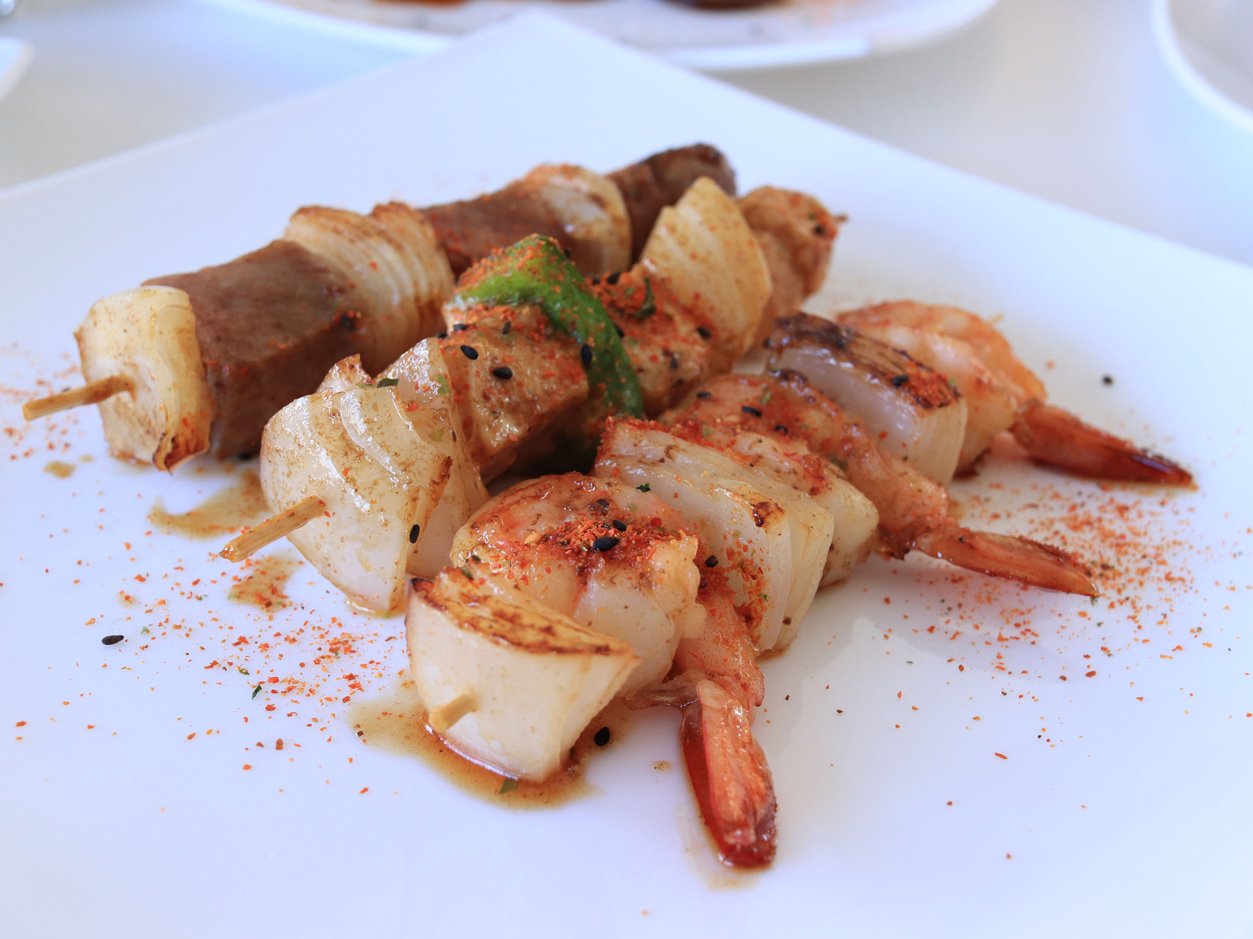 3 Piezas, brocetas asadas y marinadas en salsa teriyaki de filete de res, pollo y camarón.