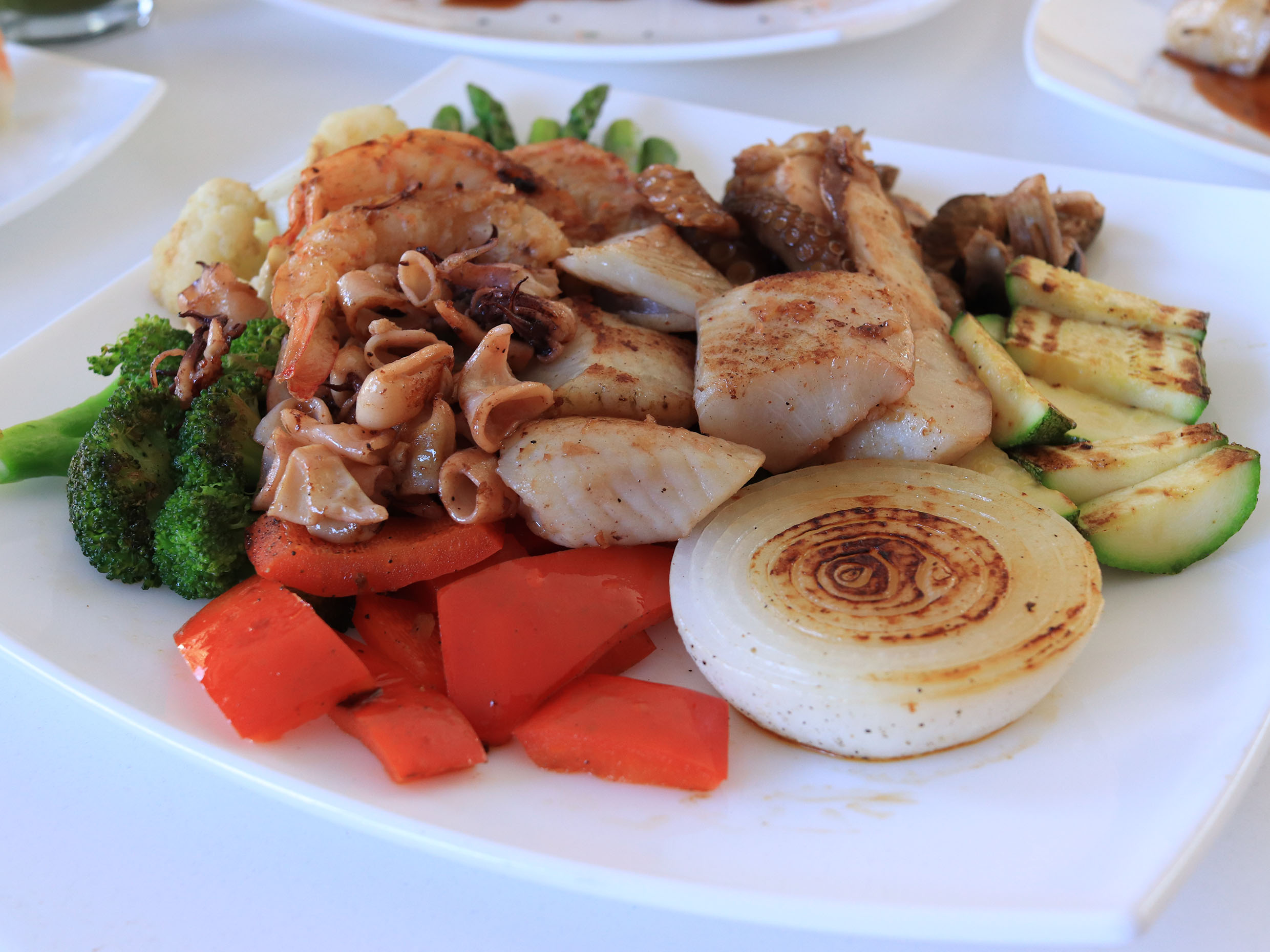 Calabaza, cebolla, champiñón, setas, brócoli, espárrago, pimiento, moyashi y filete, camarón y pollo.