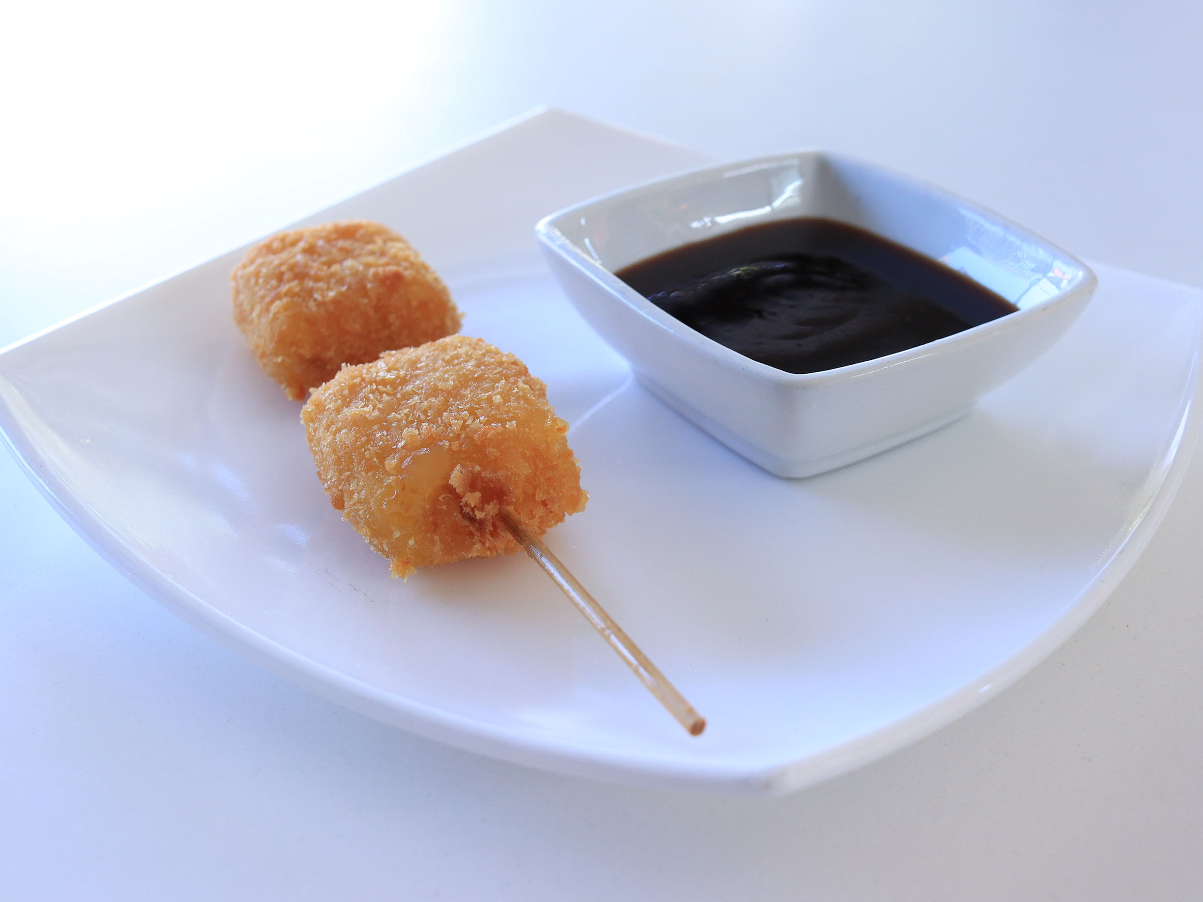 Ebi chizu y salsa tampico por dentro; aguacate por fuera; servido con salsa kushiage.