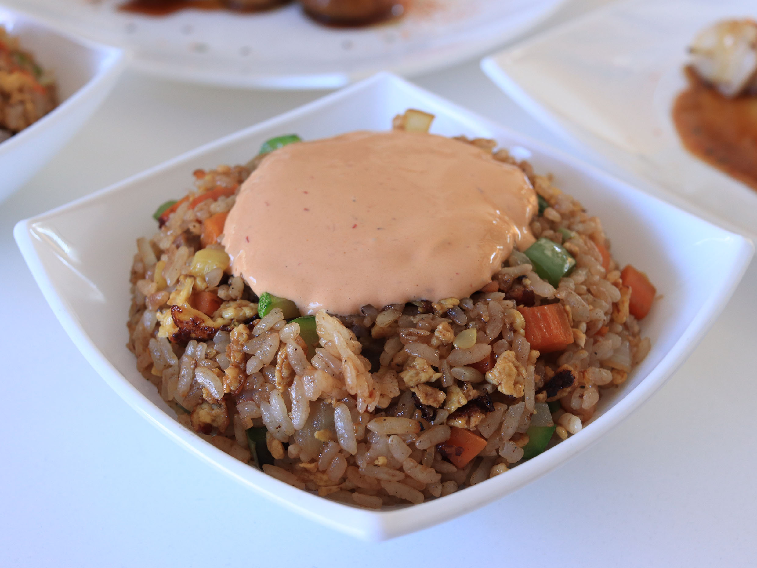 Arroz a la plancha con verduras, camarón, carne y huevo más salsa chipotle.