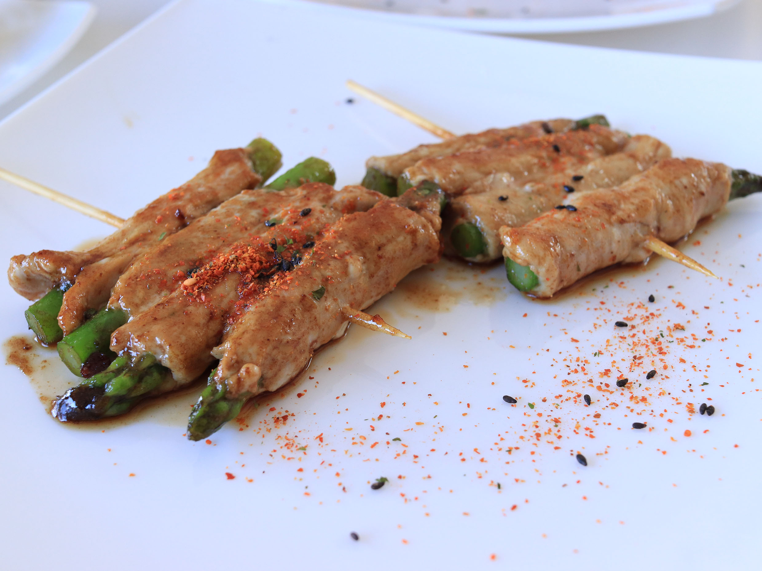 Brocheta de espárrago envuelto en lomo de cerdo.