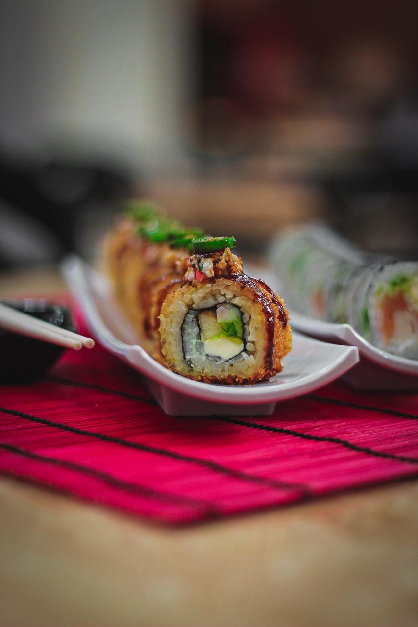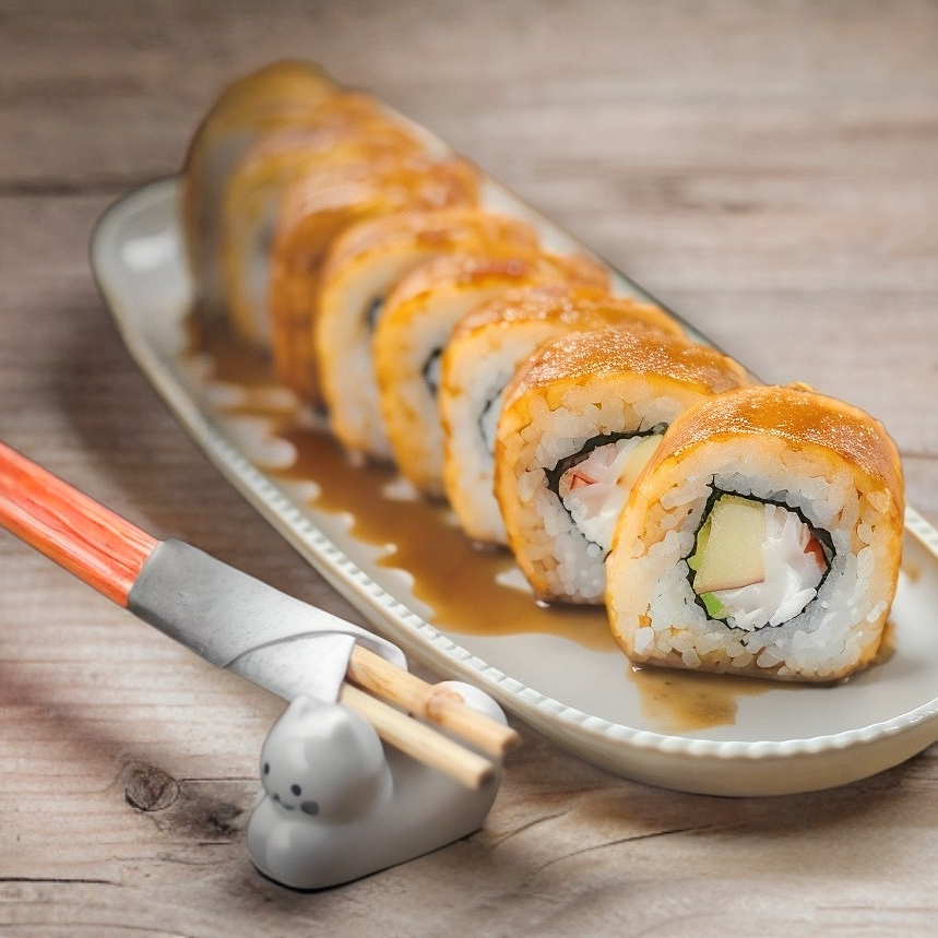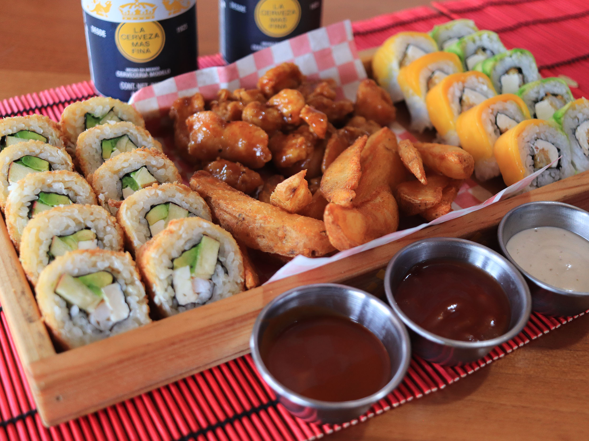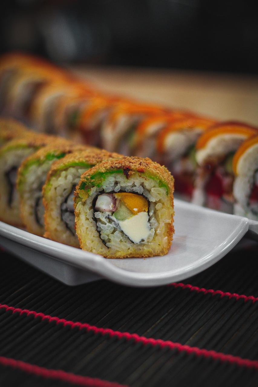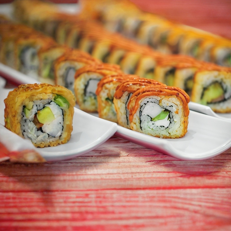 XD: aguacate, queso crema, masago. XF: plátano frito, salsa de anguila, ajonjolí.