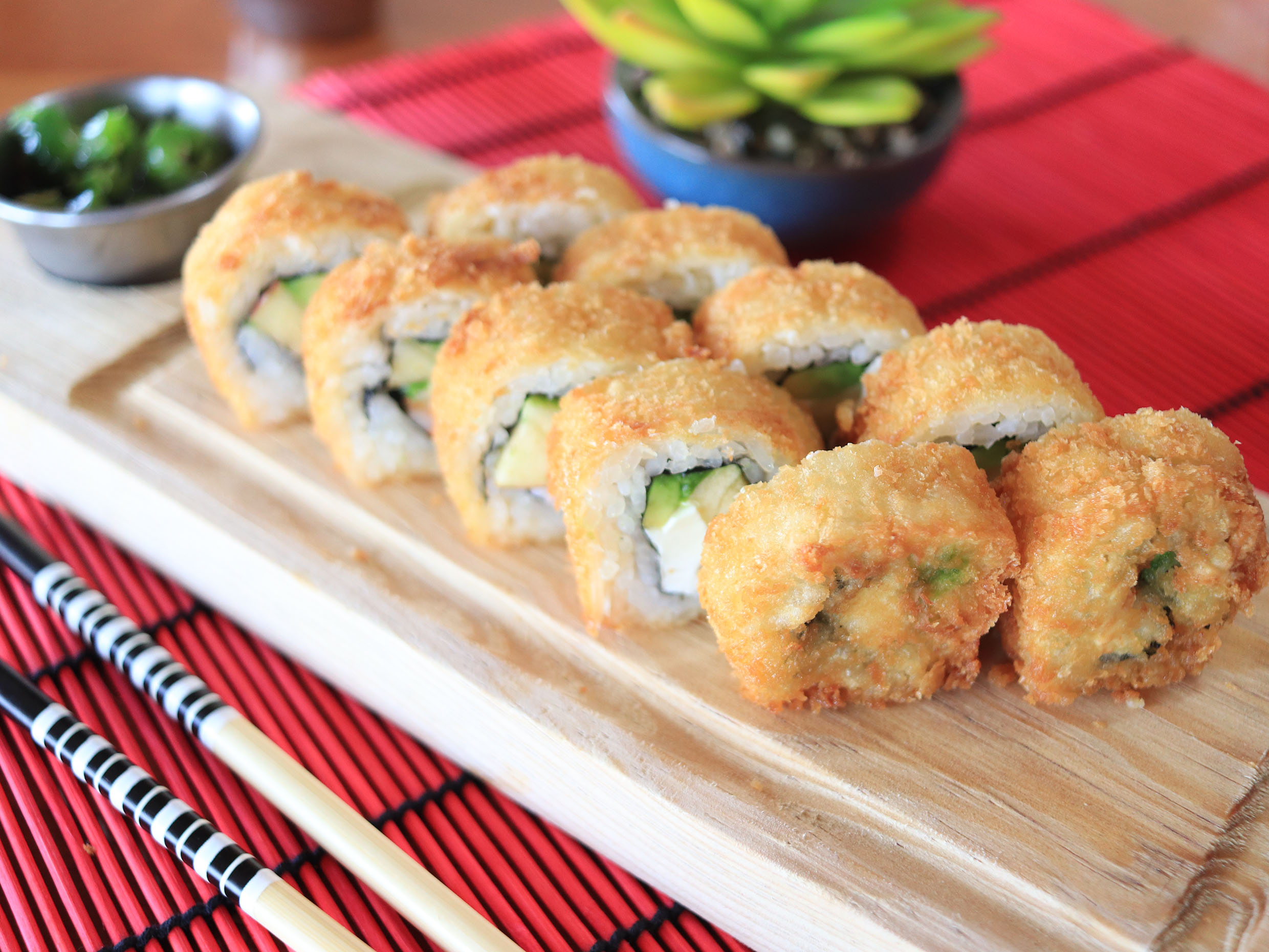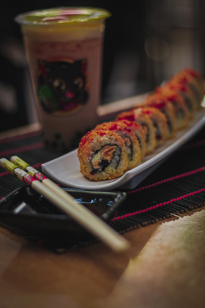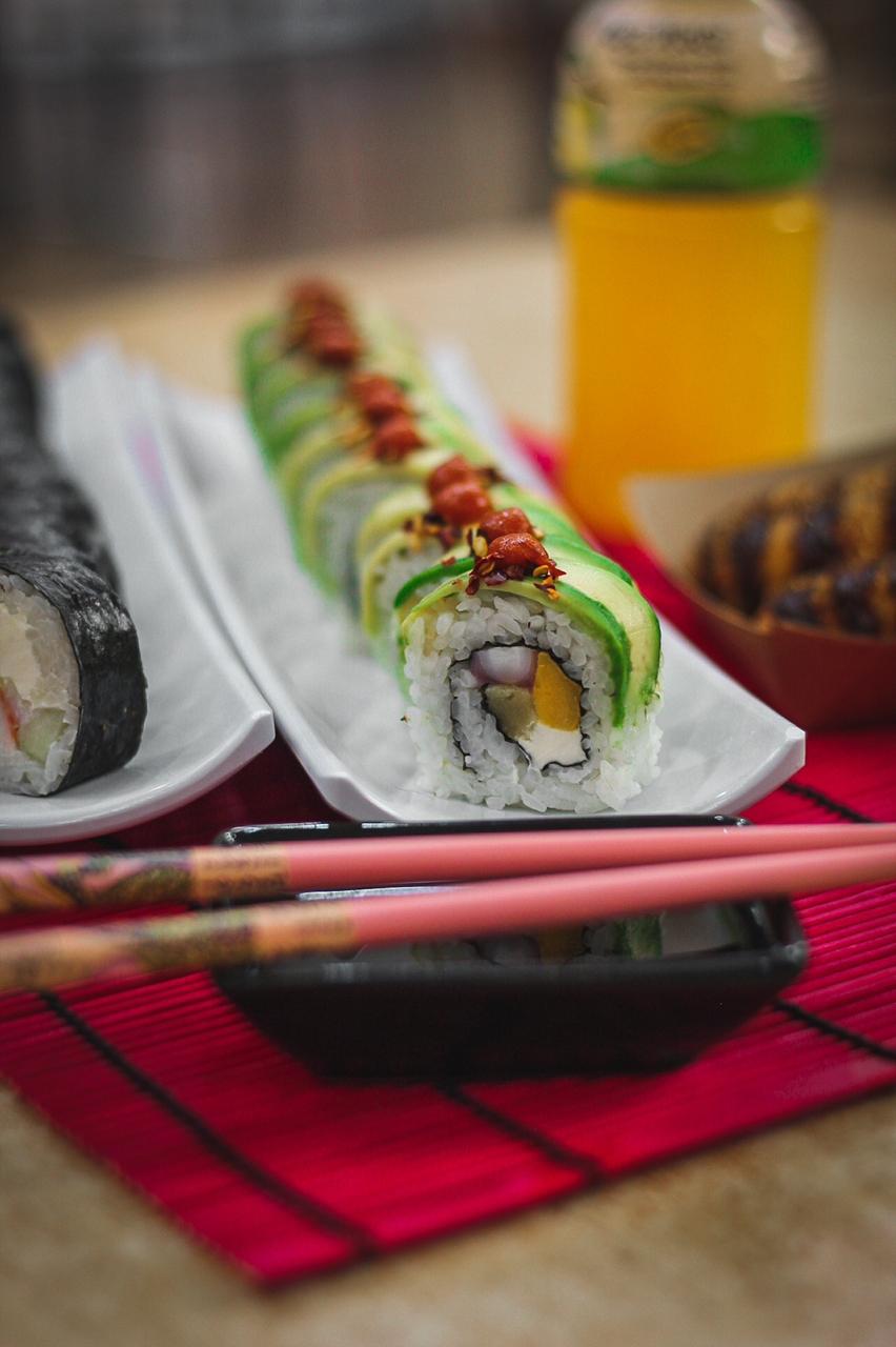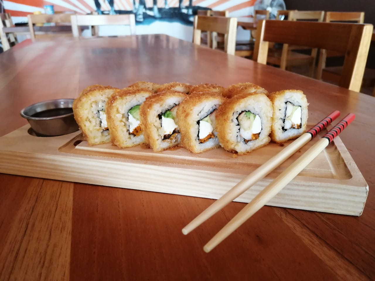 XD: aguacate, queso crema, masago. XF: plátano frito, salsa de anguila, ajonjolí.