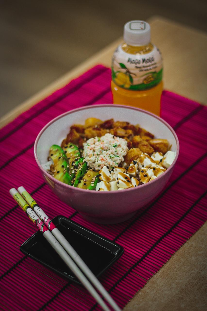 Orden de arroz blanco, queso crema, aguacate, salsa tampico, camarón empanizado, ajonjolí, salsa teriyaki.