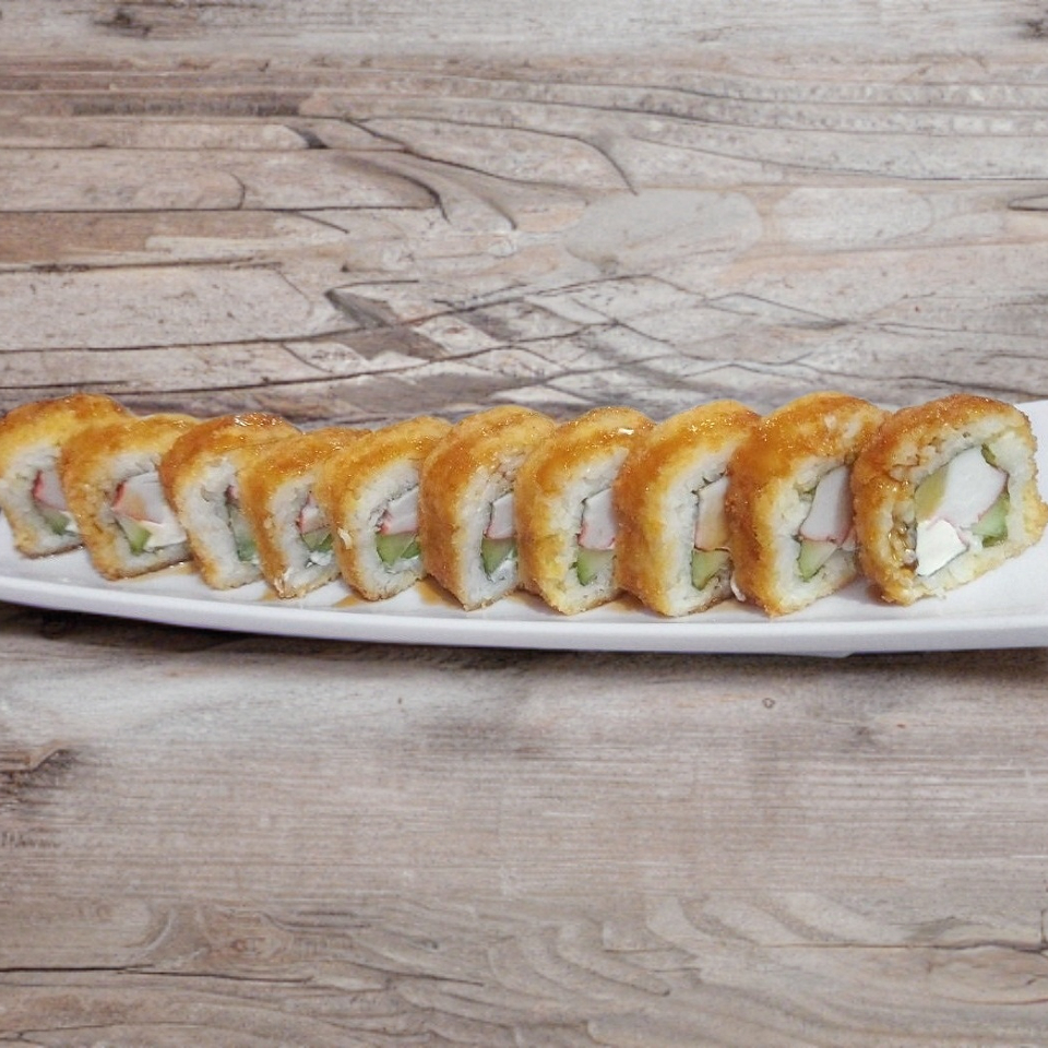 Surimi, aguacate, queso crema y aderezo de chipotle.