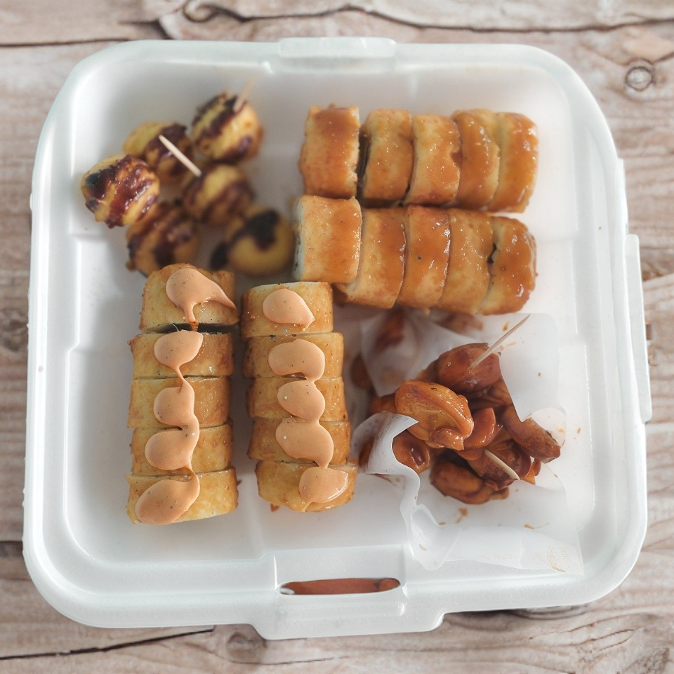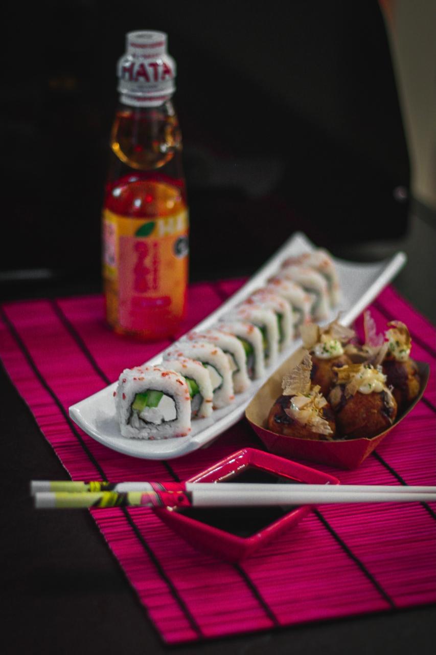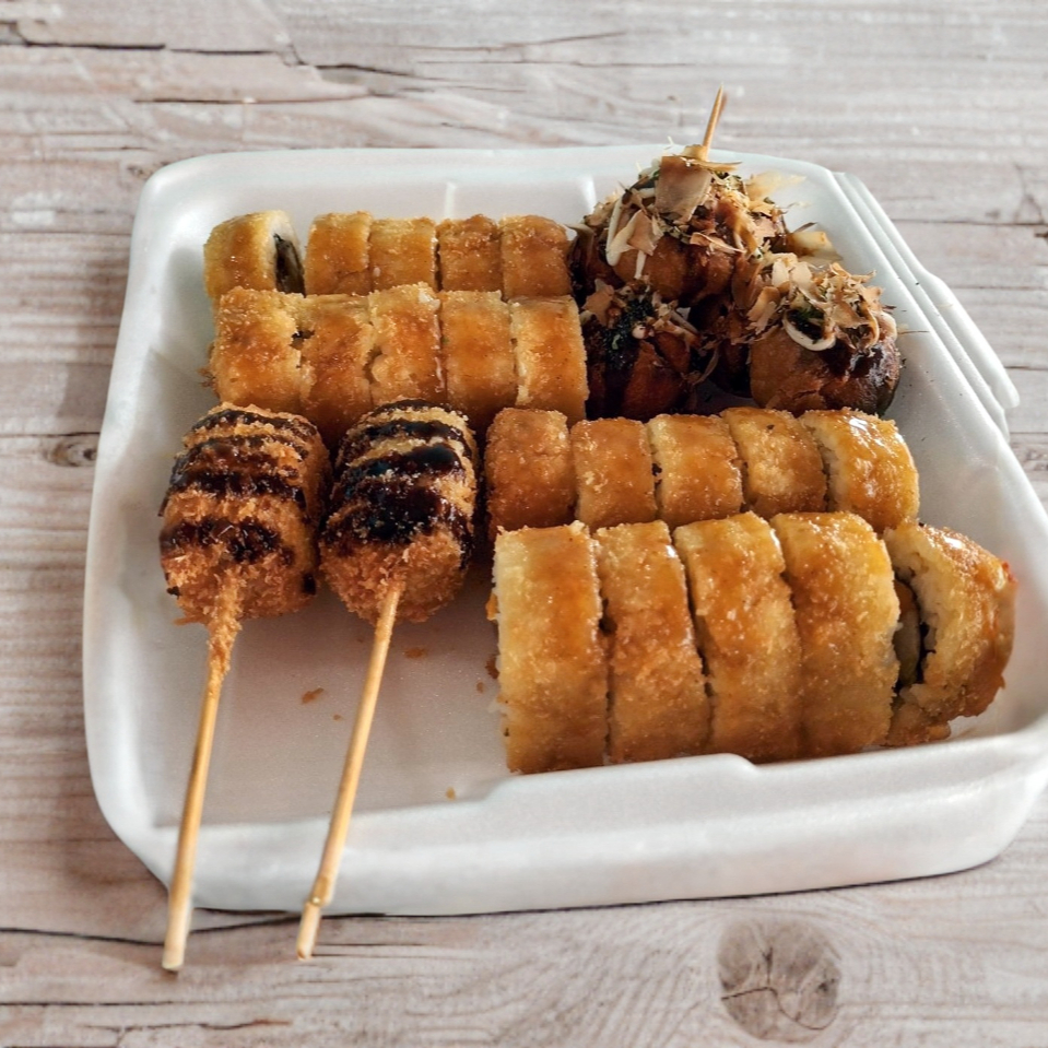 Kushiagues de plátano con queso*1 + 2 rollos para armar*1 + Té Helado*2 + 6 Tacoyakis original*1