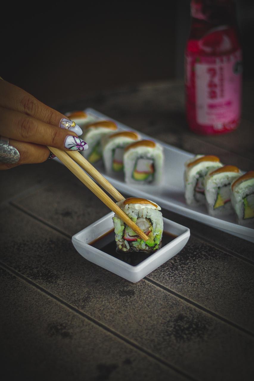 Surimi, aguacate, queso crema y ajonjolí.