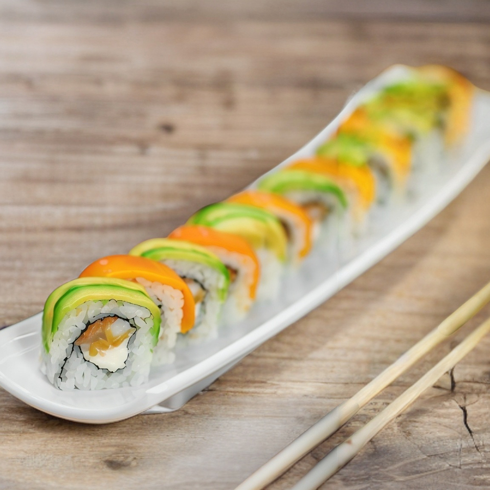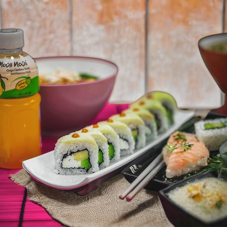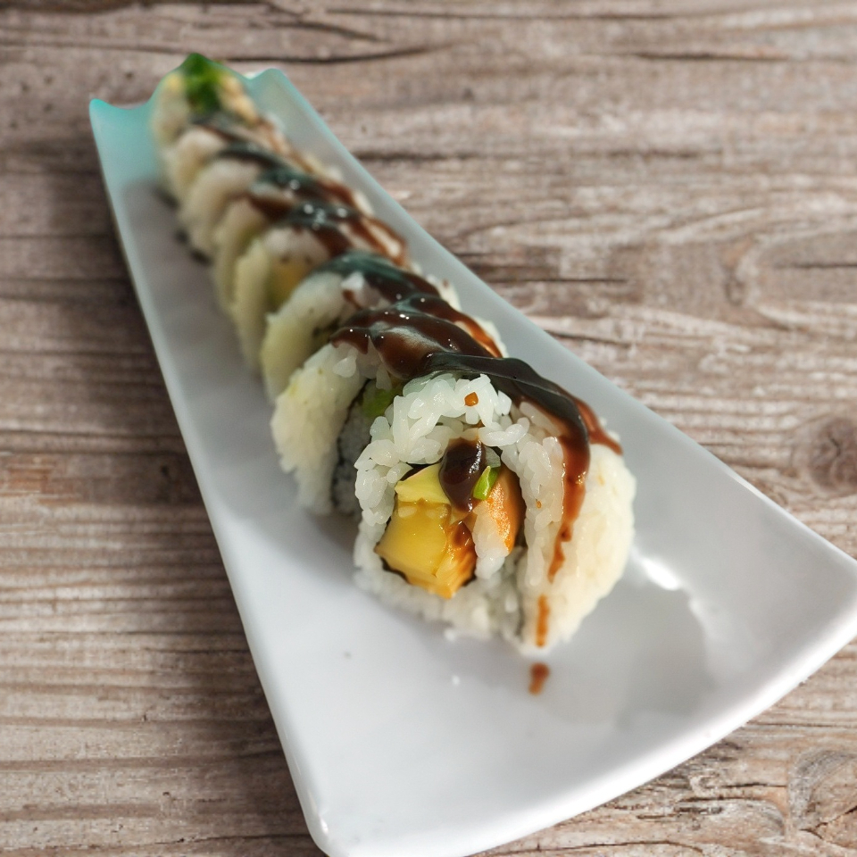 Por dentro: camarón, queso crema, aguacate, manzana. Por fuera: coco rallado, salsa de anguila. 10 piezas de sushi.