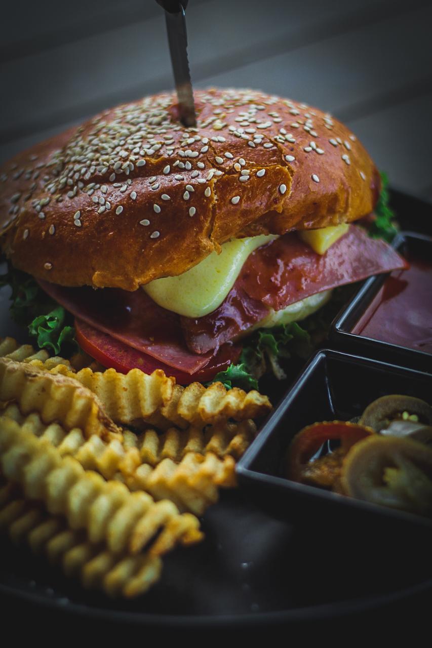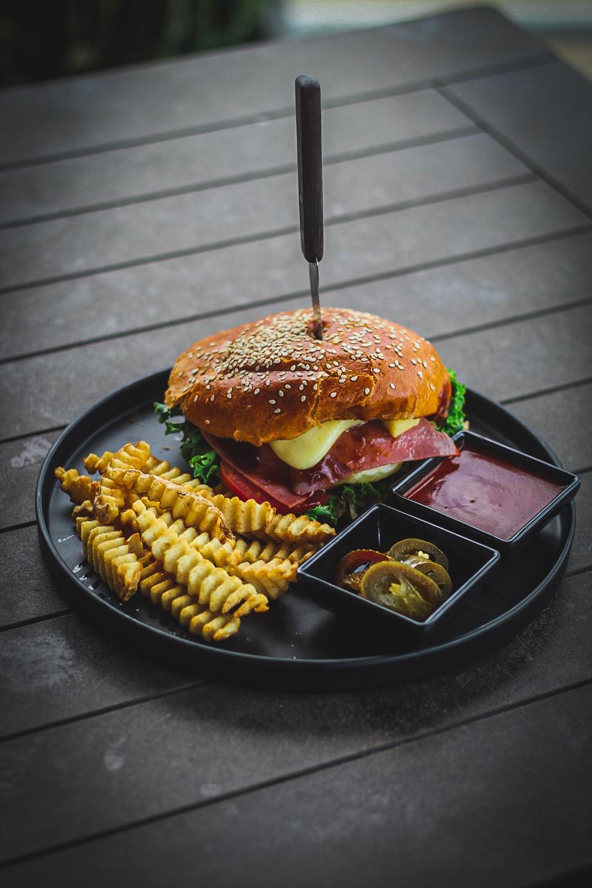 Carne de res, queso, lechuga, tomate y mayonesa.