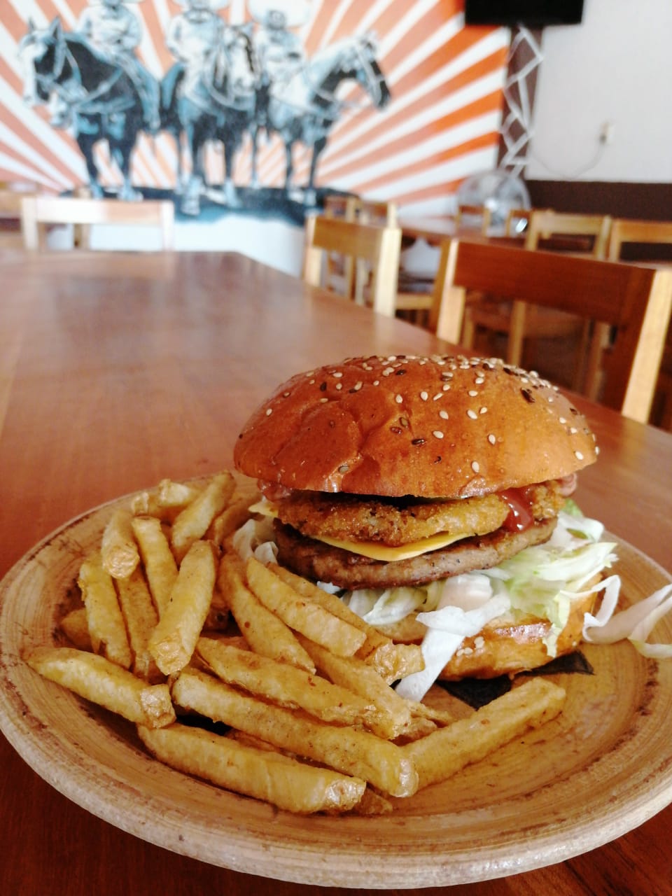 Carne de res, queso amarillo, aros de cebolla, tocino, lechuga y salsa bbq, acompañada de papas