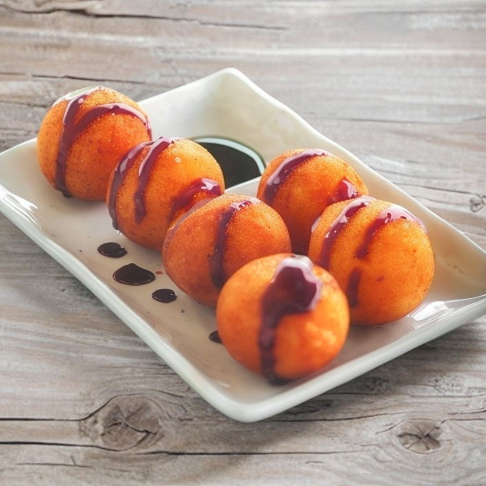 6 bolitas de queso manchego empanizadas y bañadas con salsa especial.