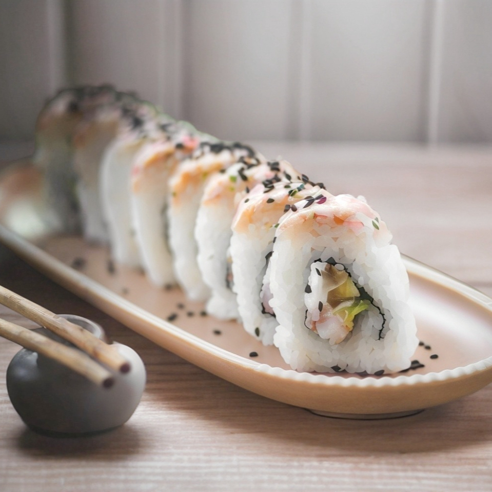Camarón, queso crema, aguacate, pepino y ajonjolí.