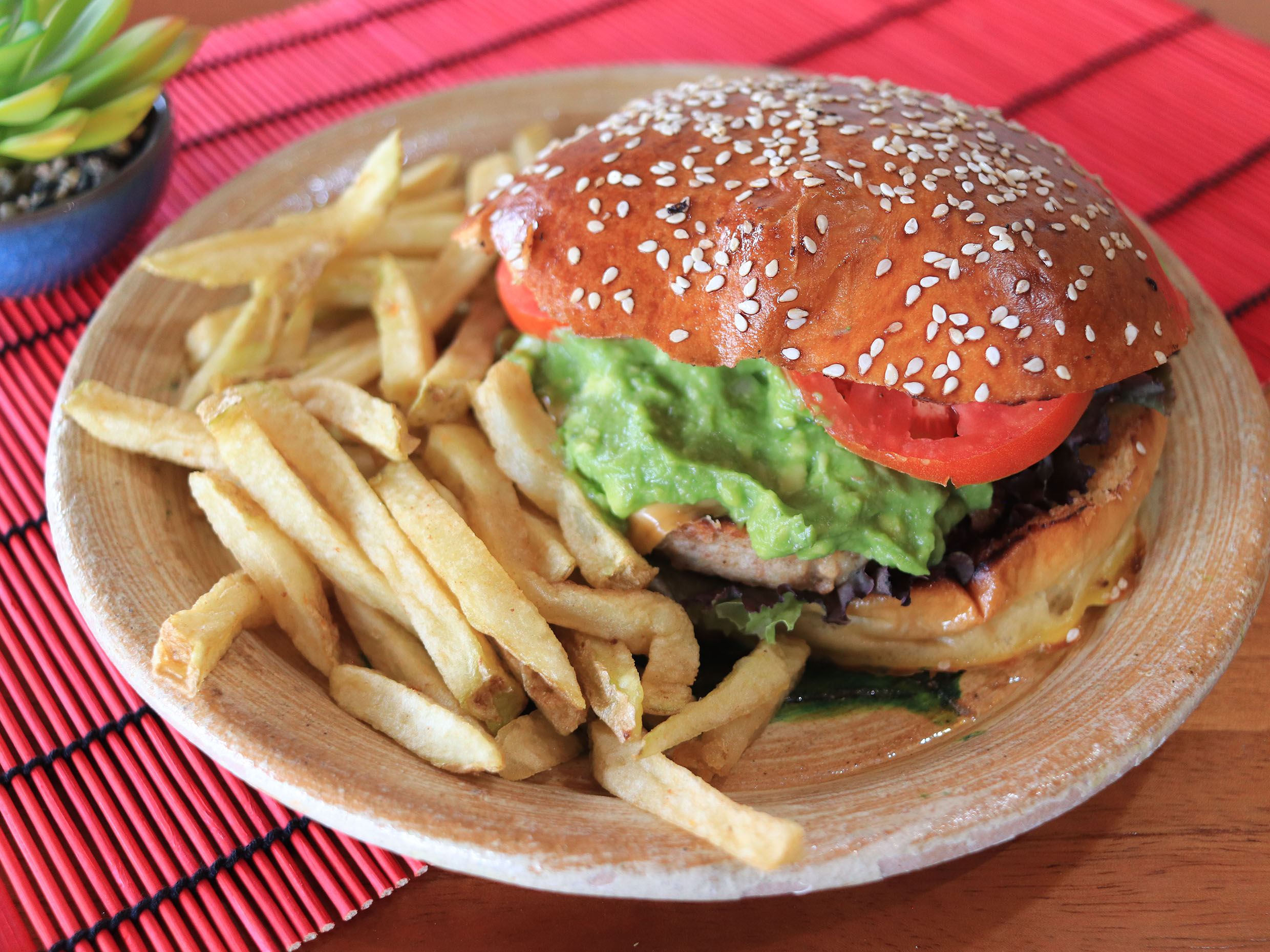 Carne de res, queso manchego, aguacate, ajonjolí y salsa siracha.