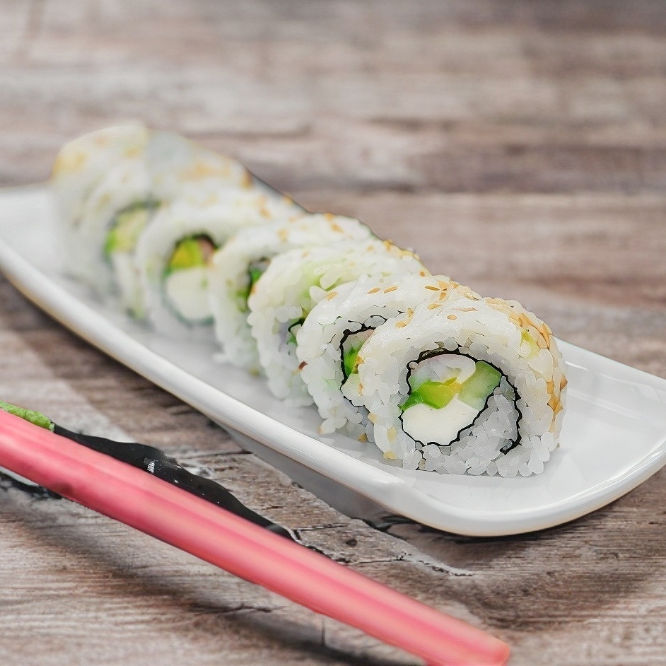 Queso crema, aguacate, pepino, zanahoria y ajonjolí.