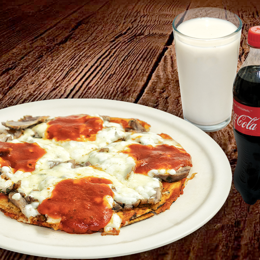 1 Pizza Árabe (pan árabe, carne árabe, salsa italiana, doble queso fundido) + 1 refresco o agua de su elección. Incluye Salsa Árabe y Limones.