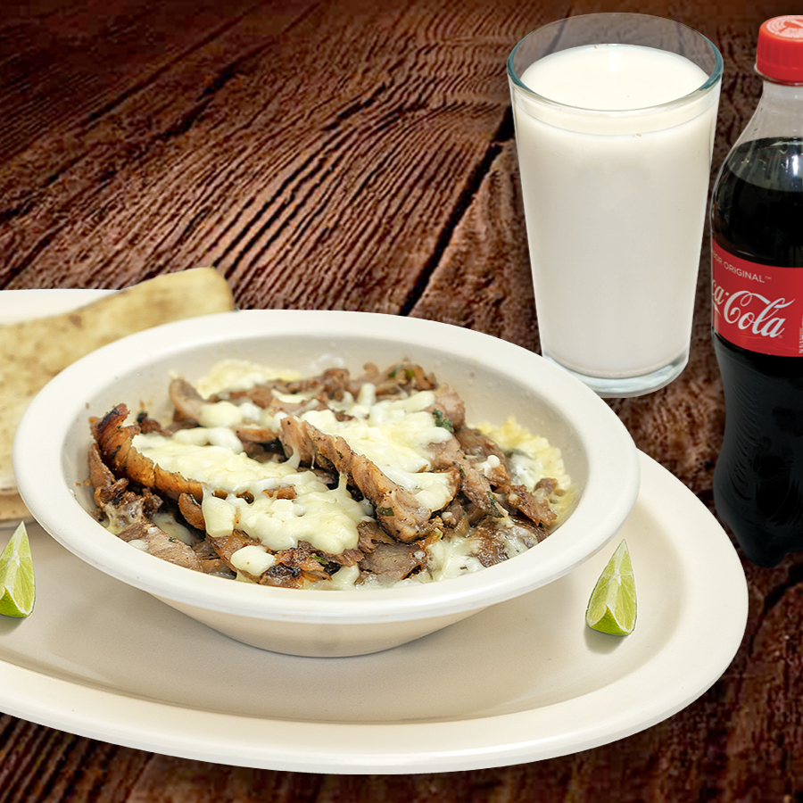 1 Queso Árabe (2 panes árabes + carne Árabe + Queso Fundido) + 1 refresco o agua de su elección. Incluye Salsa Árabe y Limones.