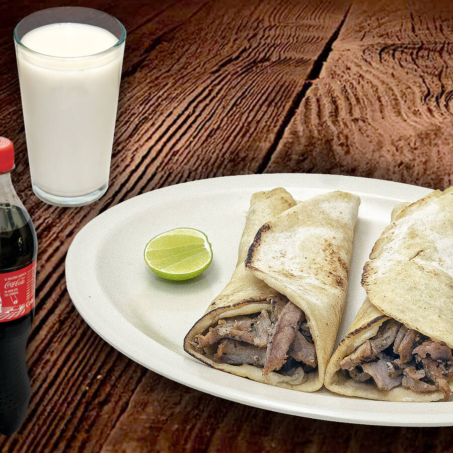 Carne Árabe, queso fundido y Tortilla de maíz. Incluye Salsa Árabe y Limones.