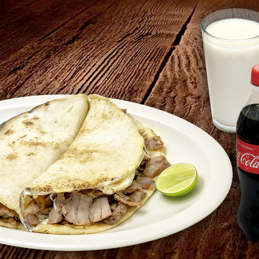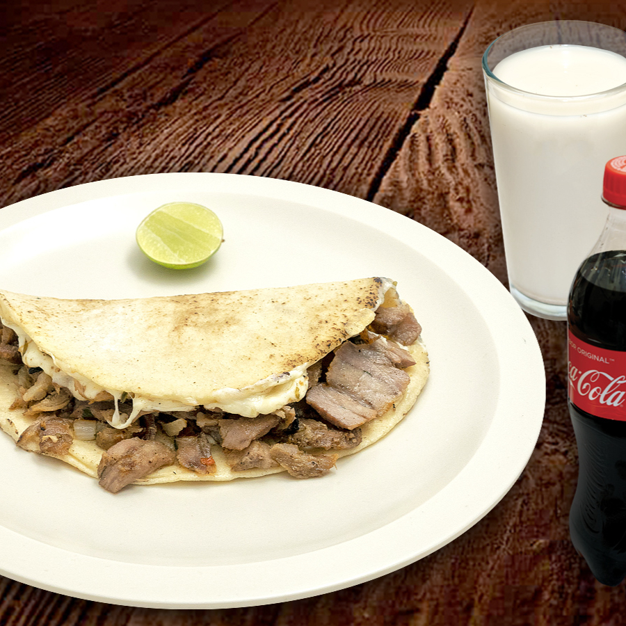 1 Quesadilla Árabe (pan árabe, carne árabe, queso fundido) + 1 refresco o agua de su elección. Incluye Salsa Árabe y Limones.