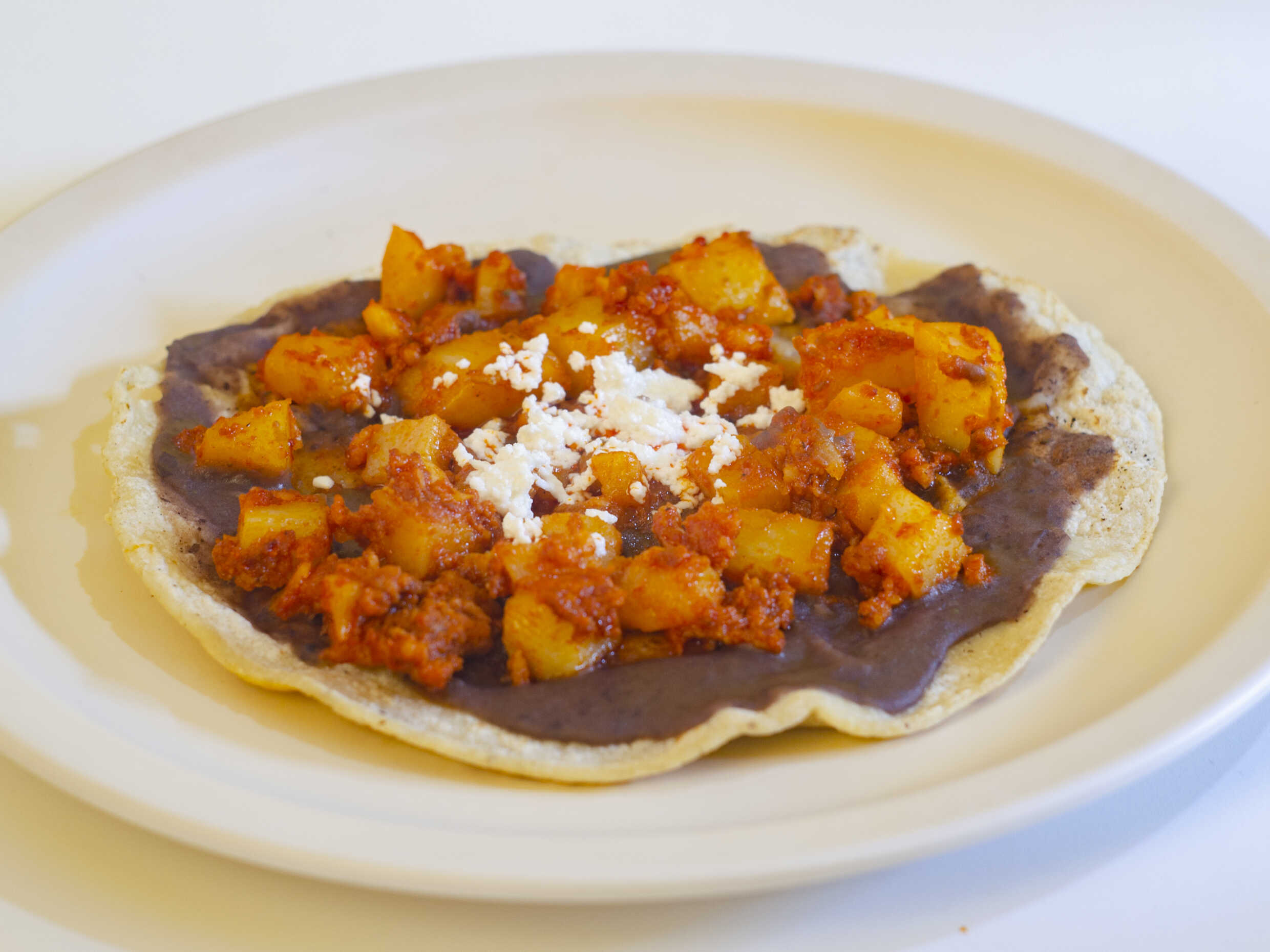 Tortilla de maíz, quesillo y guisado de papa con chorizo.
