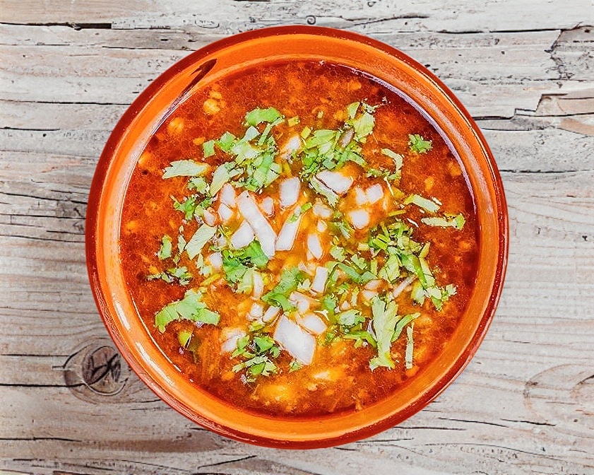 Exquisito consome de birria, acompañado de cebolla y cilantro, adicional incluye guacamole, salsa, cebolla morada con chile habanero y tostadas.