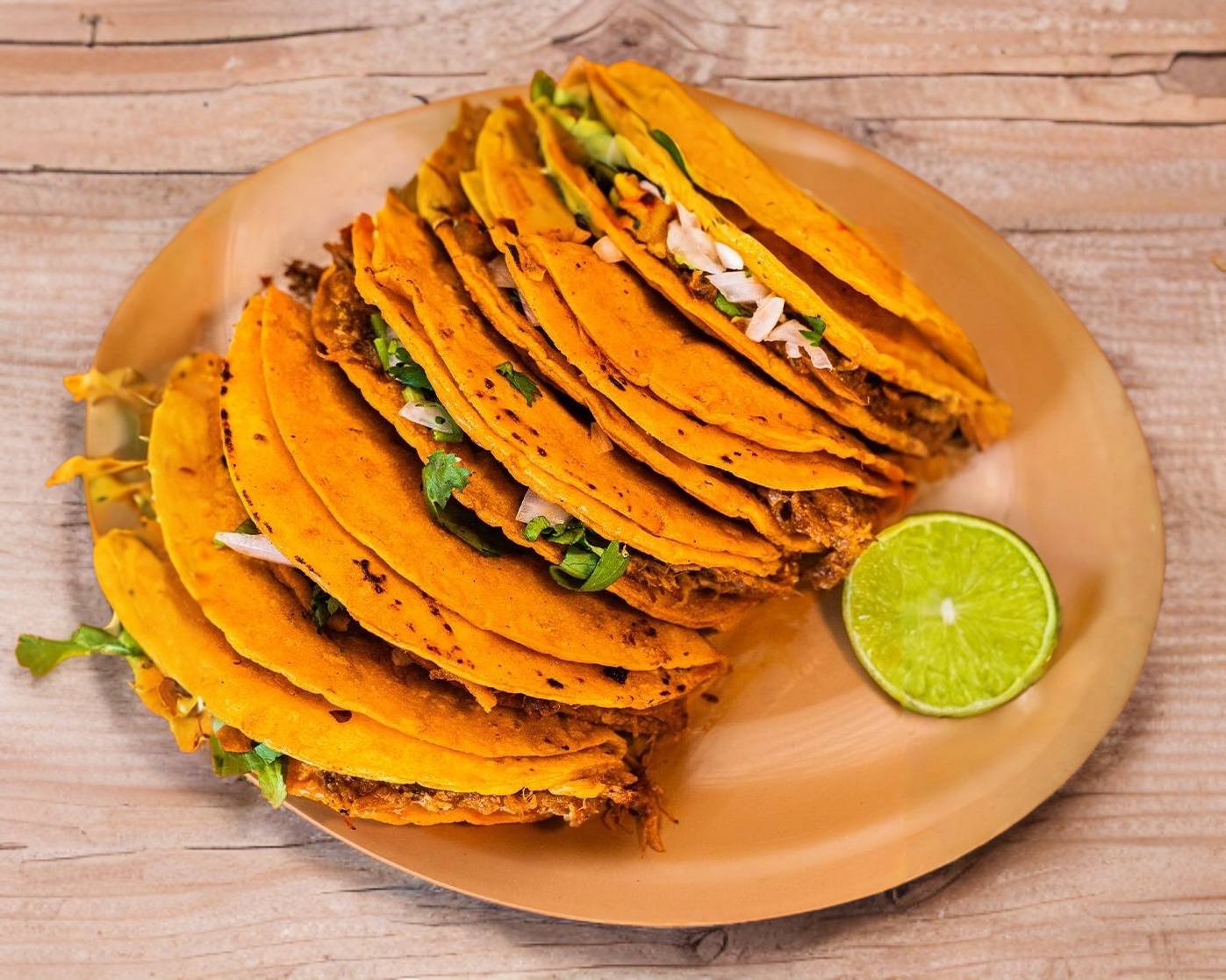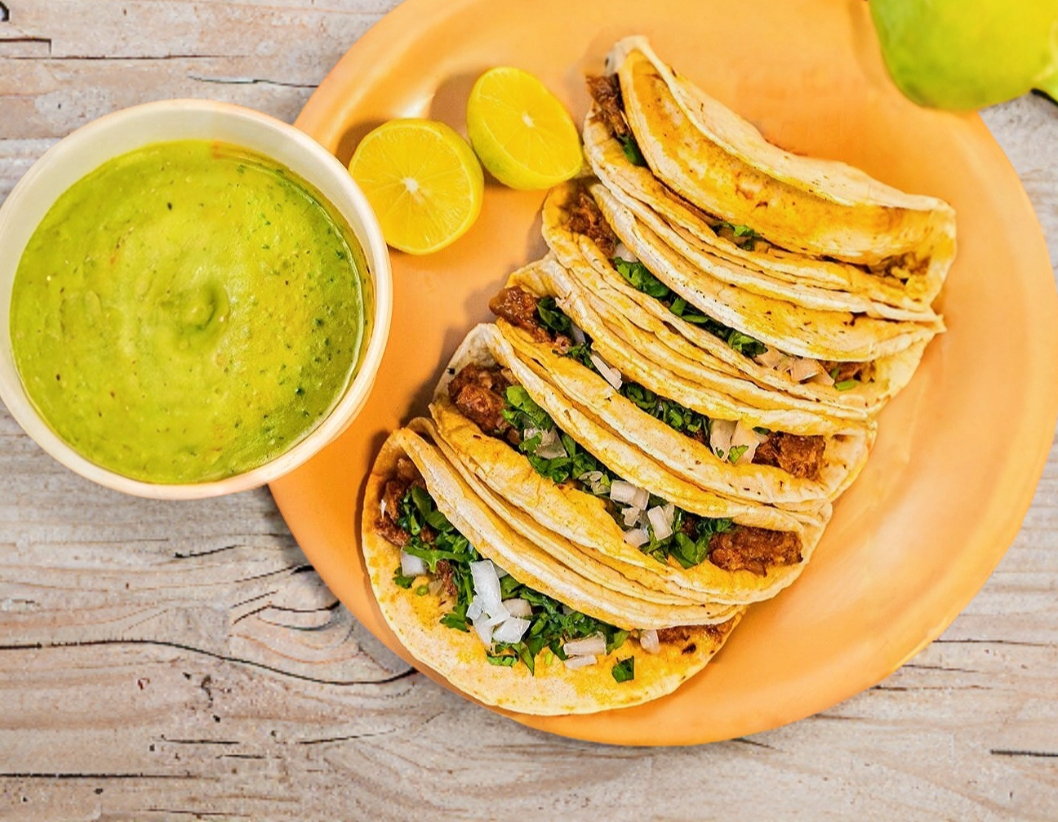 Tacos dorados a la plancha, acompañados de cebolla y cilantro, adicional incluye guacamole, salsa, limones y cebolla morada con chile habanero