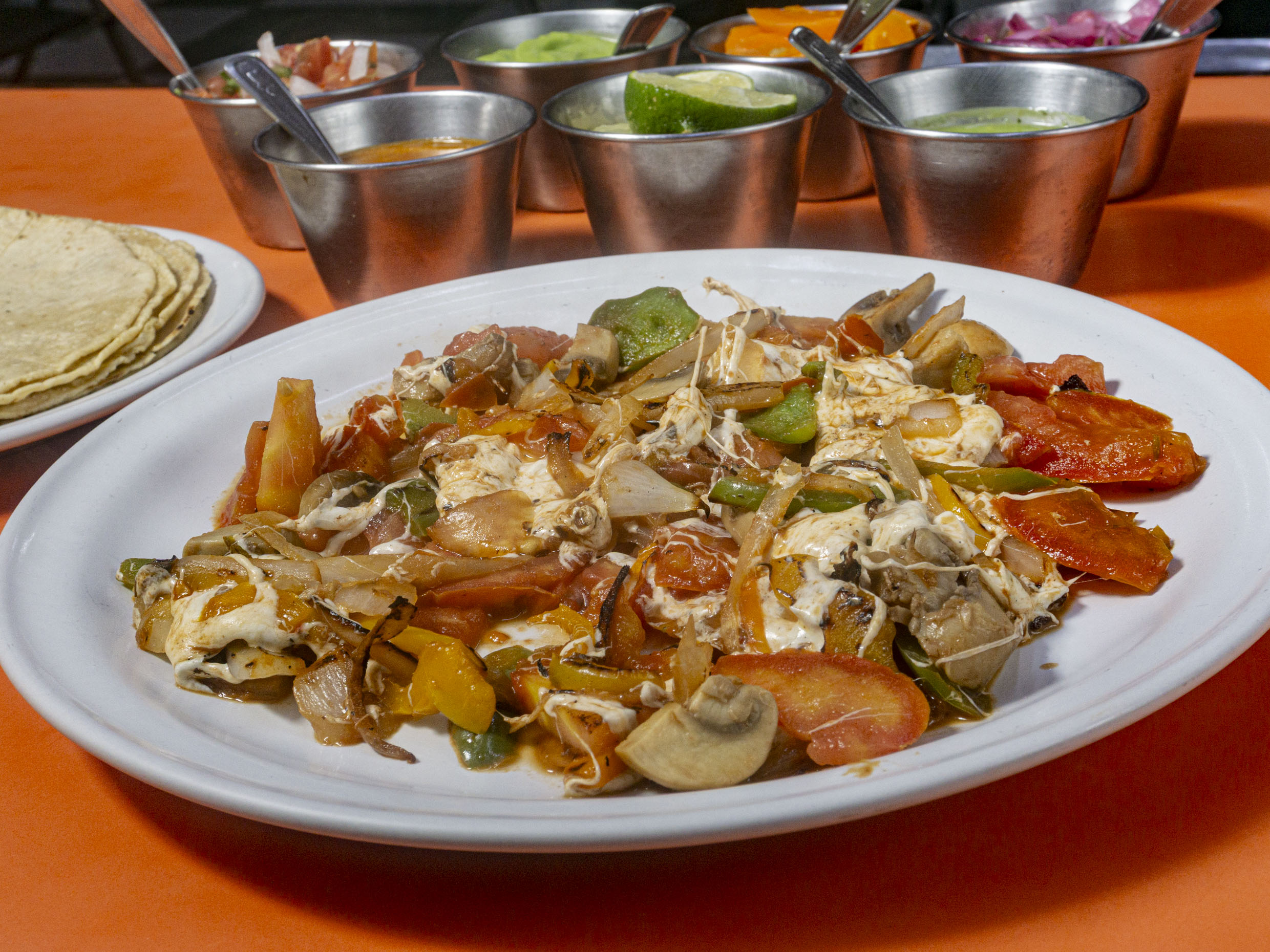 Cebolla, pimiento morrón, tocino, bistec de res, jamón, carne al pastor, tomate y quesillo.