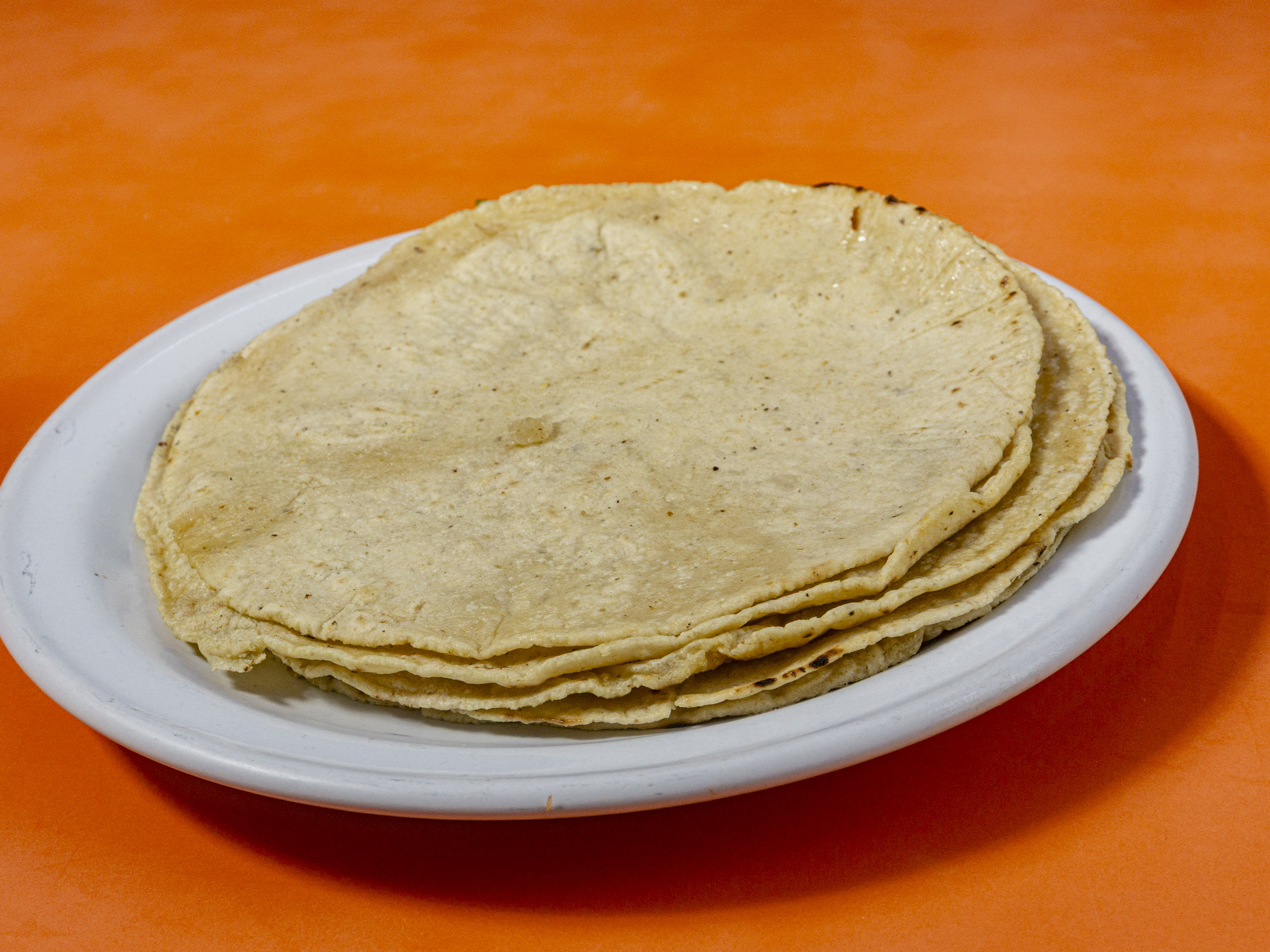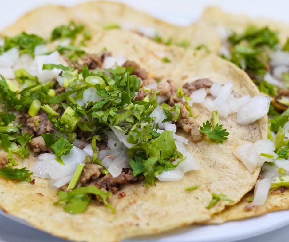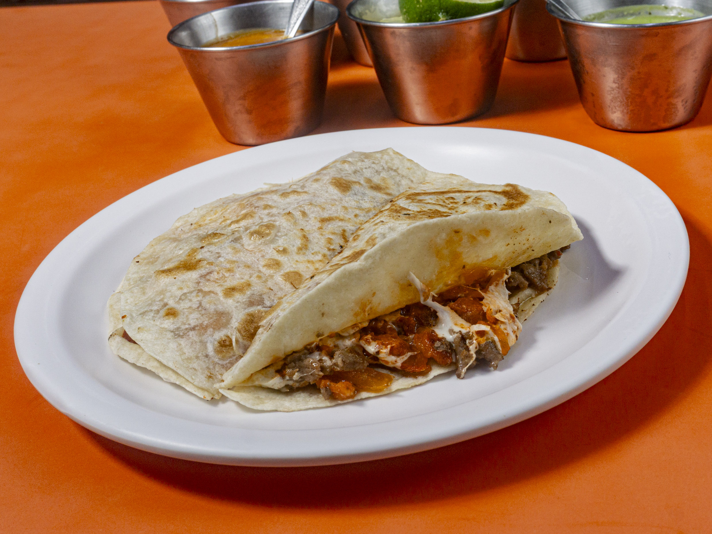 Tortilla de harina, queso fundido y carne al pastor o bistec, cilantro, cebolla