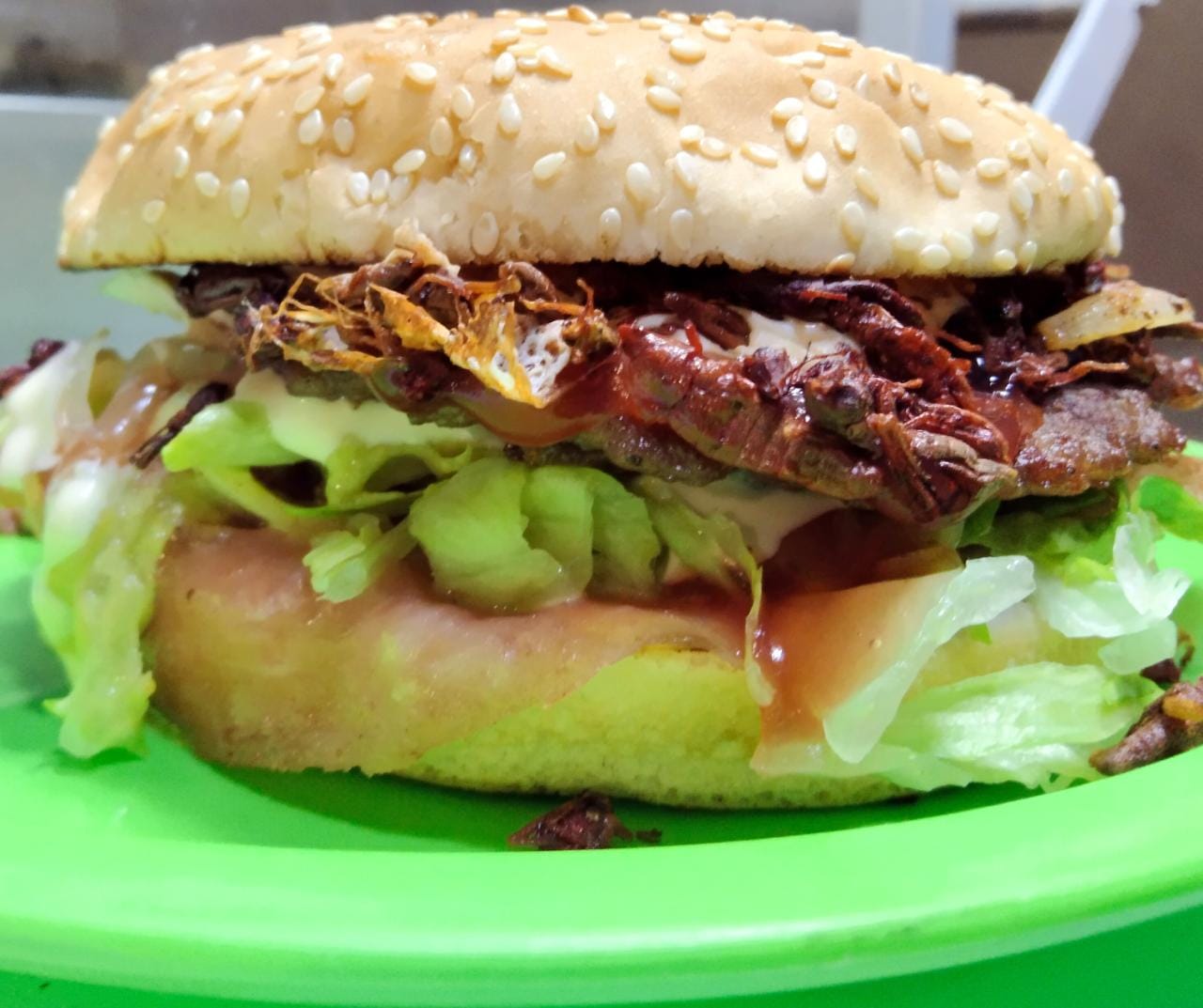 carne de res, jamón queso amarillo, quesillo, chapulines, lechuga, tomate cebolla frita, aderezo y picante