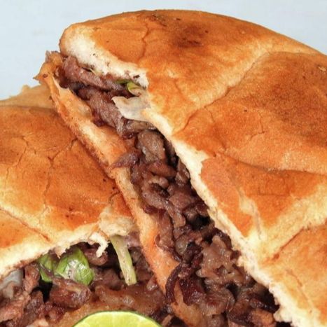 Bistec de res, pasta de frijol, mayonesa, lechuga, tomate, picante, aguacate y quesillo.