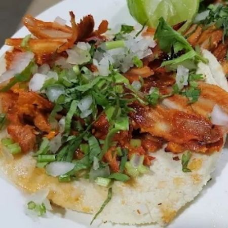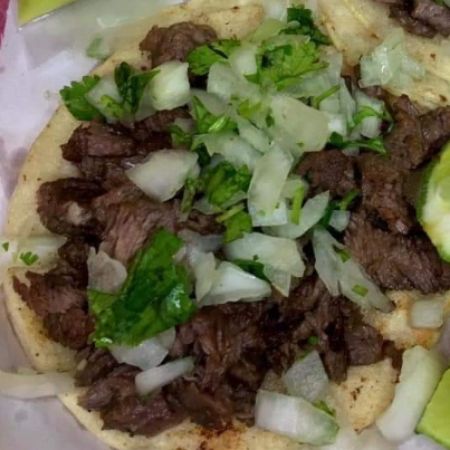 Taco con doble tortillas de maíz, cebolla, cilantro.